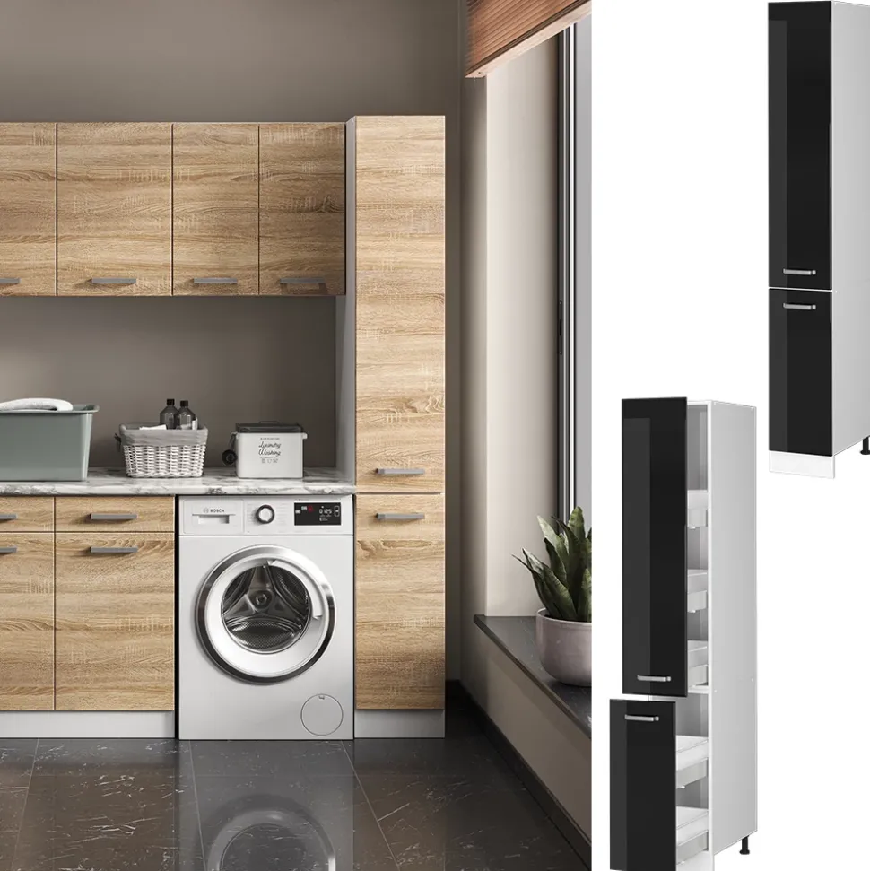 R-Line“ ist eine vielseitige Möbellinie mit Küchenzeilen, montagefertigen Komponenten und Schränken für den, Haushalts-, Wäsche- und Kreativbereich. Sie bietet eine breite Auswahl an Farben und Größen, die individuelle Lösungen für jeden Raum ermöglichen. Die Unterschränke sind mit verstellbaren Füßen ausgestattet, so dass sie einzeln oder als komplettes Set konfiguriert werden können, um den unterschiedlichen Bedürfnissen gerecht zu werden und die Funktionalität in verschiedenen Umgebungen zu verbessern.