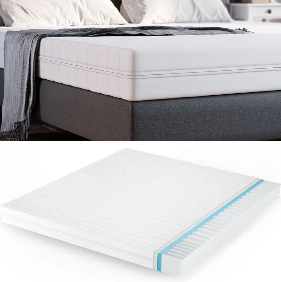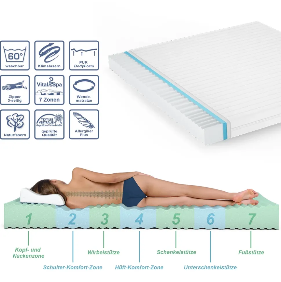 Entdecken Sie die perfekte Lösung für einen erholsamen Schlaf auf der Kaltschaummatratze mit H3 Härtegrad mit 7-Zonen und Memory-Effekt. Diese Wendematratze ist für Menschen über 80 kg konzipiert und sorgt durch ihre optimierte Wellenmuster-Sitzfläche für eine perfekte Körperanpassung und Druckentlastung. Der abnehmbare Bezug ermöglicht eine einfache Reinigung und hygienische Handhabung. Ob Sie auf dem Rücken oder der Seite schlafen, diese Schaummatratze bietet den perfekten Komfort und unterstützt Ihre Wirbelsäule für eine erholsame Nachtruhe. Erleben Sie das Gefühl von Luxus und Entspannung mit dieser Memory-Matratze und genießen Sie den Komfort von 7-Zonen-Schaumstofftechnologie. Investieren Sie in Ihre Gesundheit und erleben Sie pure Entspannung auf der Kaltschaummatratze H3 Härtegrad, 7-Zonen.