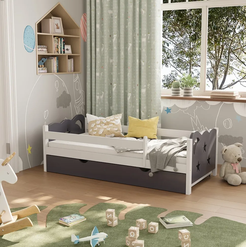 Das Bett mit Schublade bringt gleichermaßen Komfort und Stauraum. Dank der großen Schublade ist ausreichend Stauraum geboten für Bettzubehör und Spielzeug. Das am Sternenhimmel angelehnte Design lädt zum Träumen ein und ist optisch ein richtiger Hingucker. Durch die Seitenbretter ist Ihr Kind abgesichert.