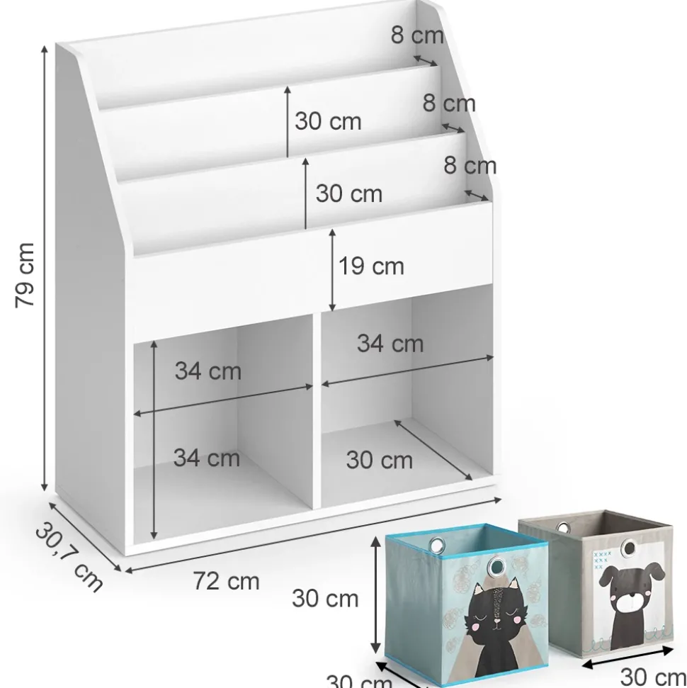 - MAßE: Das Bücherregal für Kinder hat eine Breite von 72 cm, eine Höhe von 79 cm und eine Tiefe von 30,7 cm. Alle detaillierten Größen sind auf den Fotos angegeben.