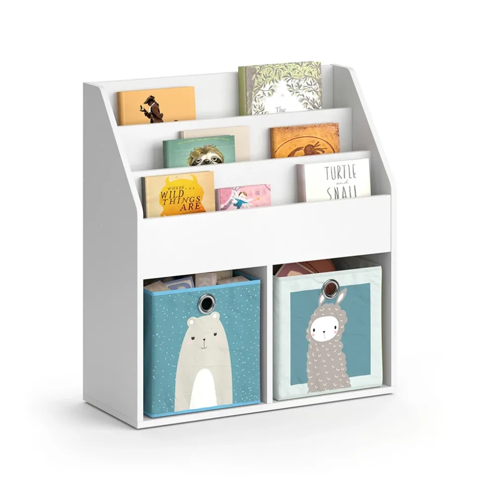 - Das Spielzeugregal für Faltboxen bietet bequeme Aufbewahrungsmöglichkeiten für Bücher und Spielzeug dank drei offener Ablagen und zwei Box-Fächern.