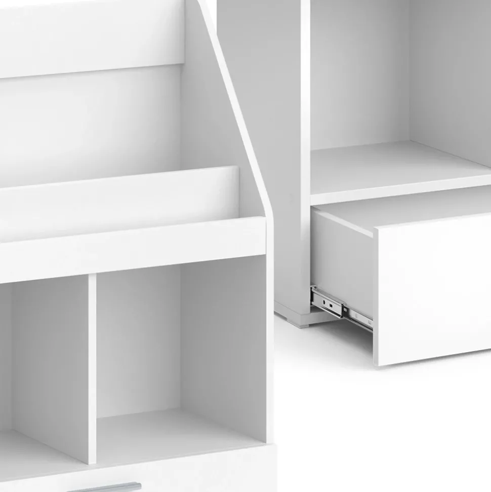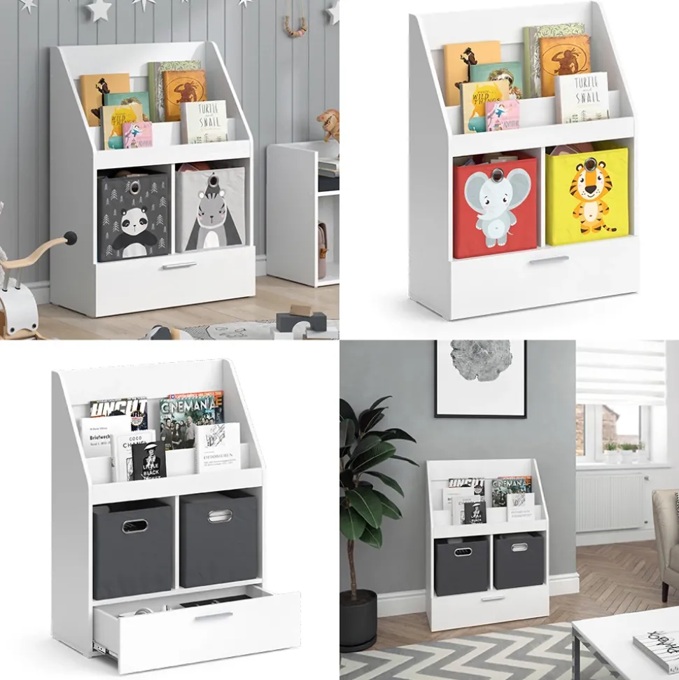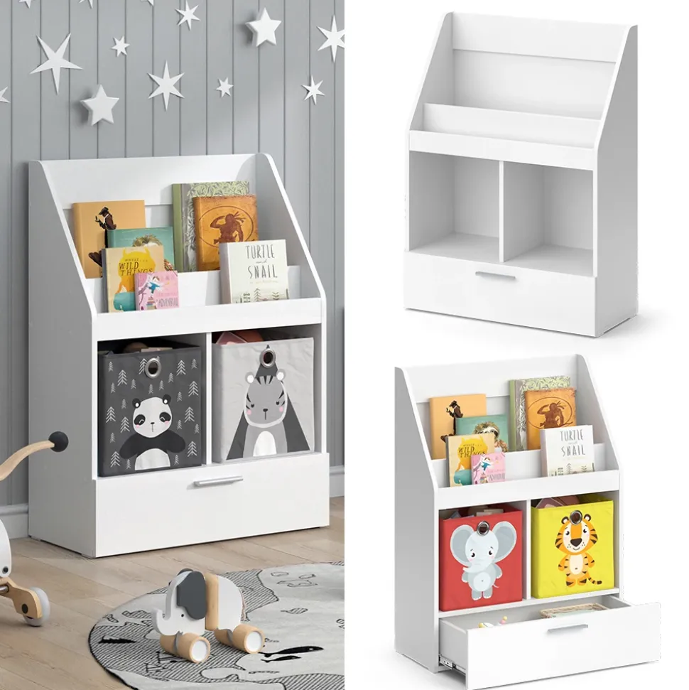 - Das Spielzeugregal für Faltboxen bietet 2 offene Ablagen und 2 Regale für Boxen, sowie eine ausziehbare Schublade zur einfachen Aufbewahrung von Spielzeug.