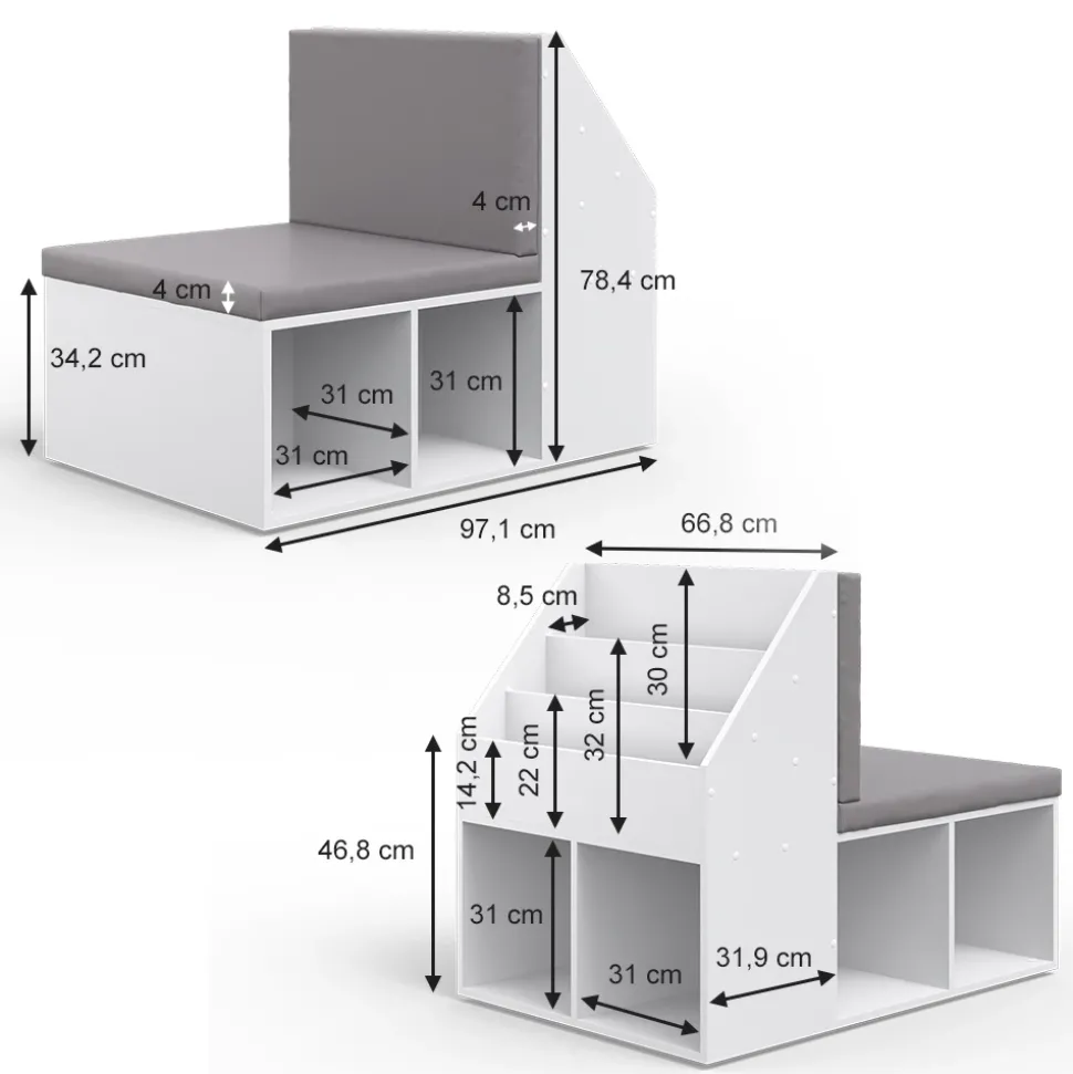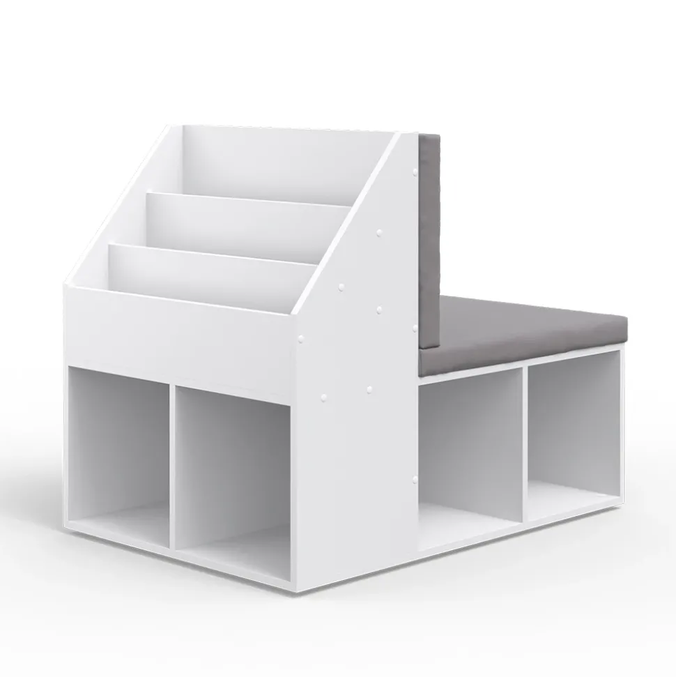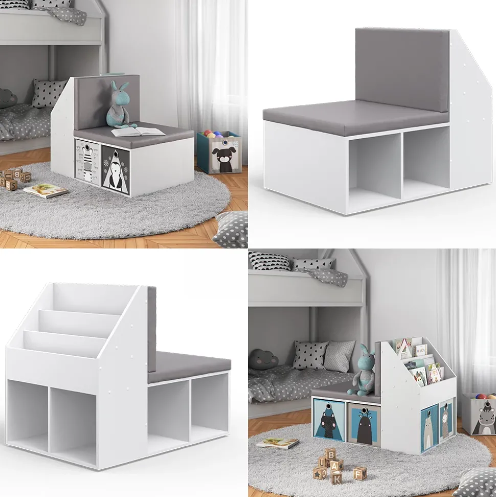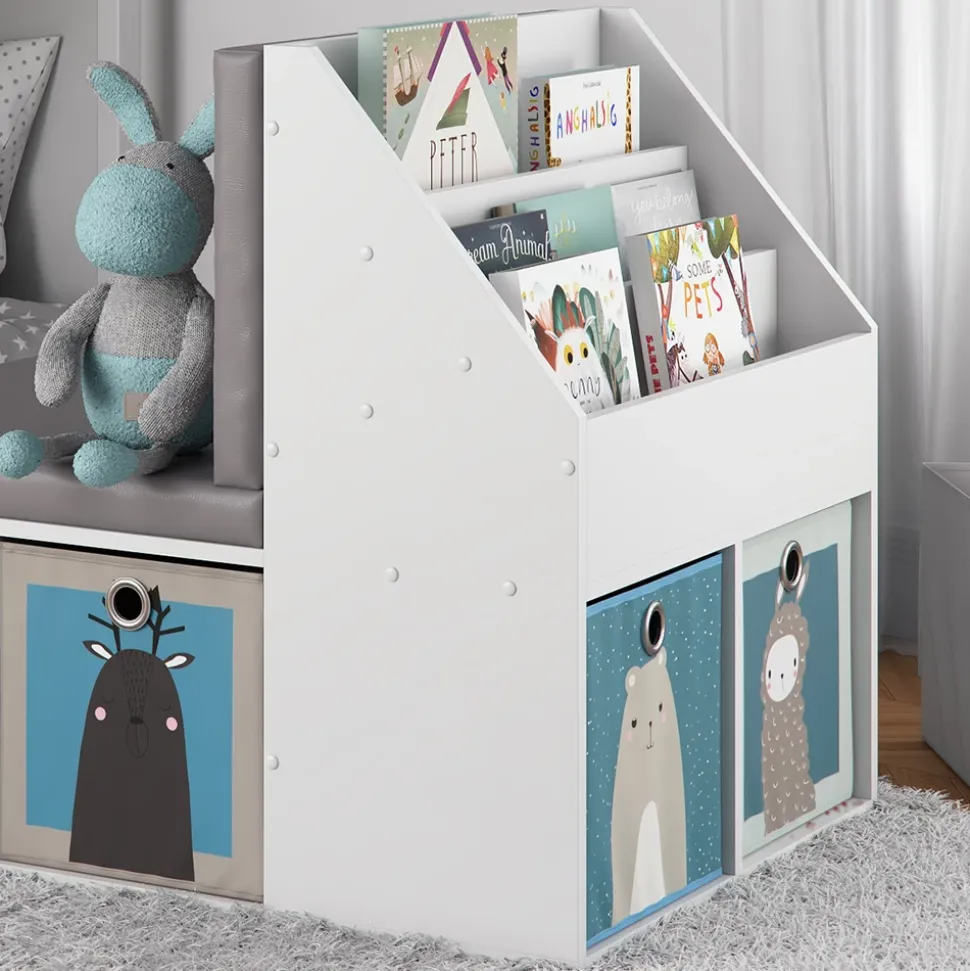 - Das Spielzeugregal für Faltboxen bietet 6 offene Ablagen und bequeme Sitzgelegenheiten mit gepolstertem Sitz – perfekt für eine organisierte Spielzeugaufbewahrung.
