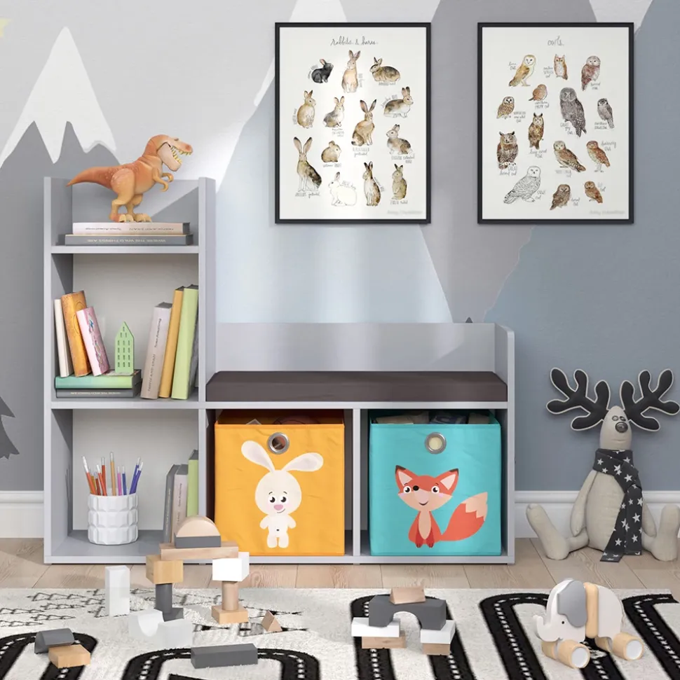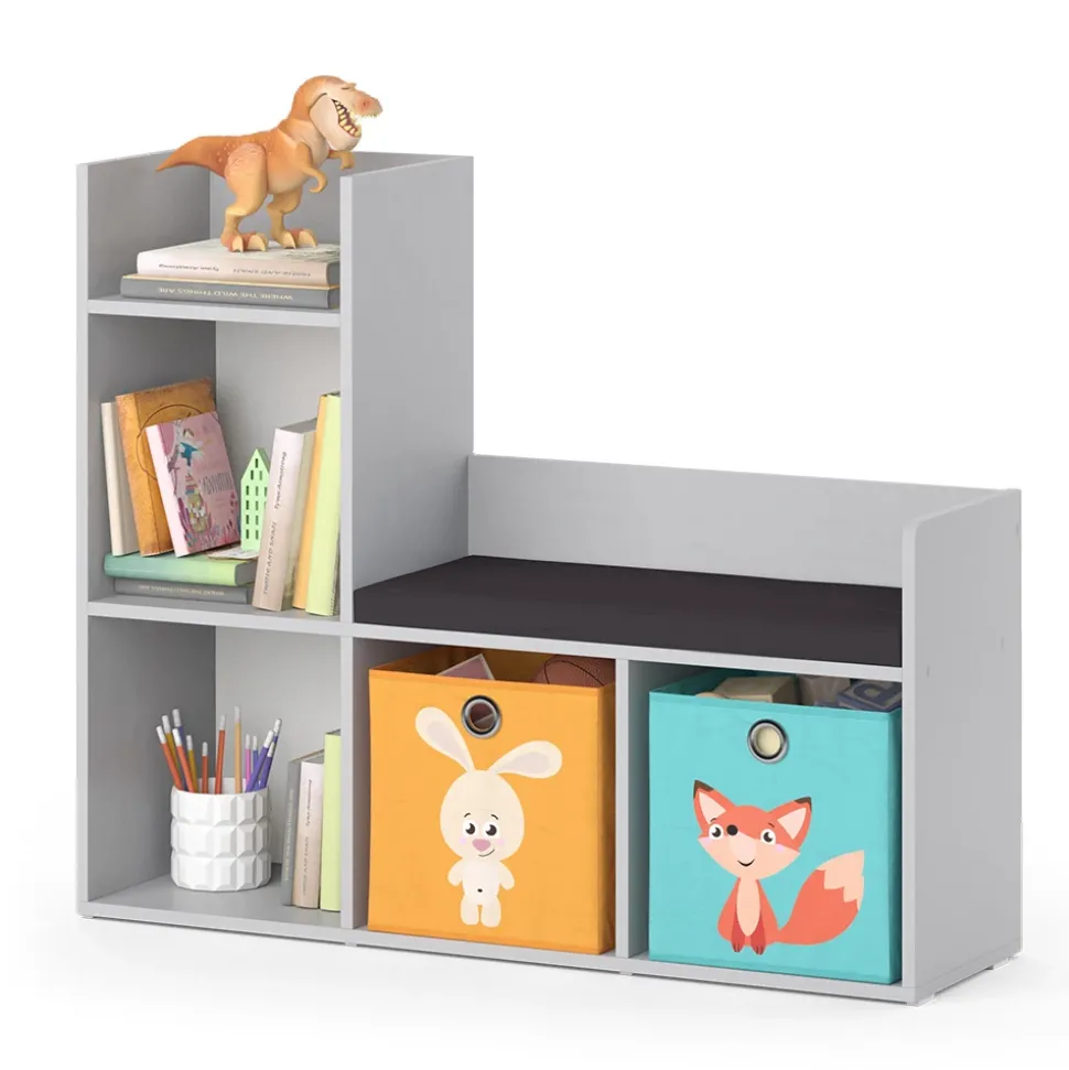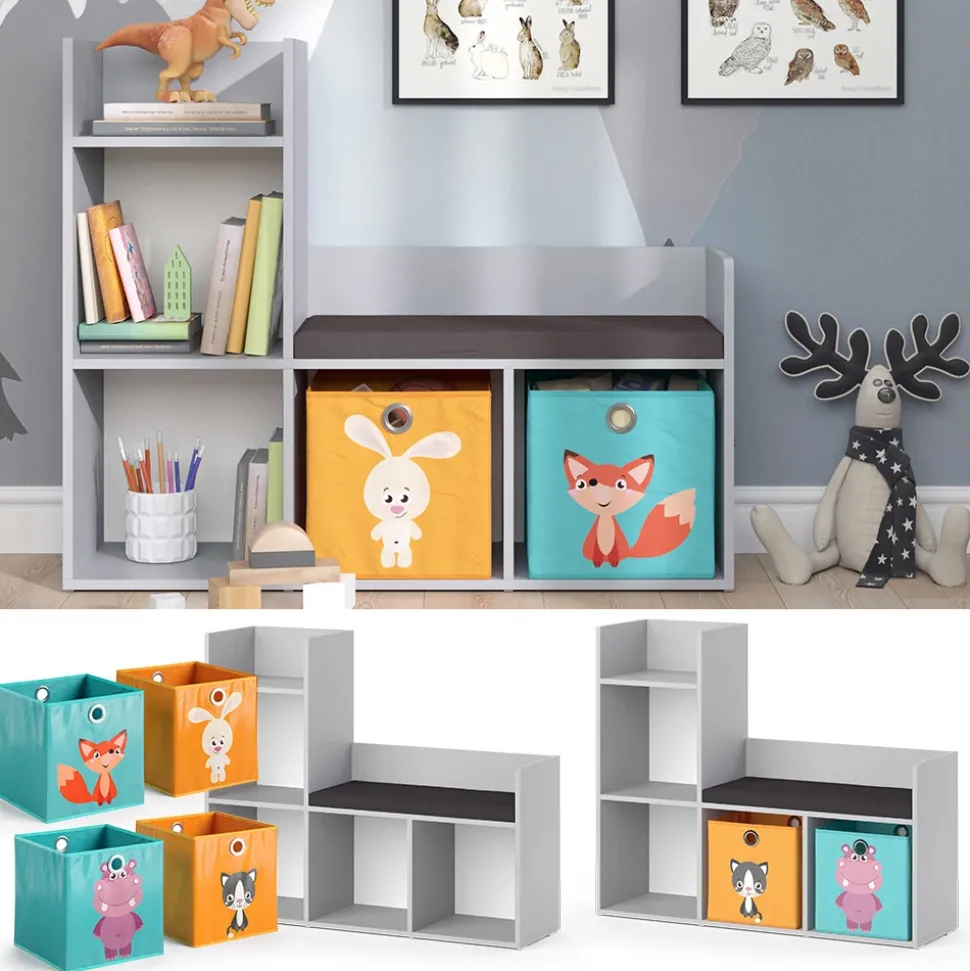 - Das Spielzeugregal mit Sitzbank Luigi, bietet vier offene Regale für die Aufbewahrung von Spielzeug und eine Sitzgelegenheit mit gepolsterter Sitzfläche.