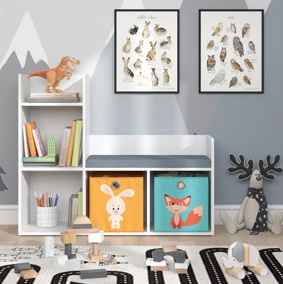 - Das Spielzeugregal mit Sitzbank bietet 4 offene Regale und eine bequeme Sitzgelegenheit mit gepolstertem Sitz.