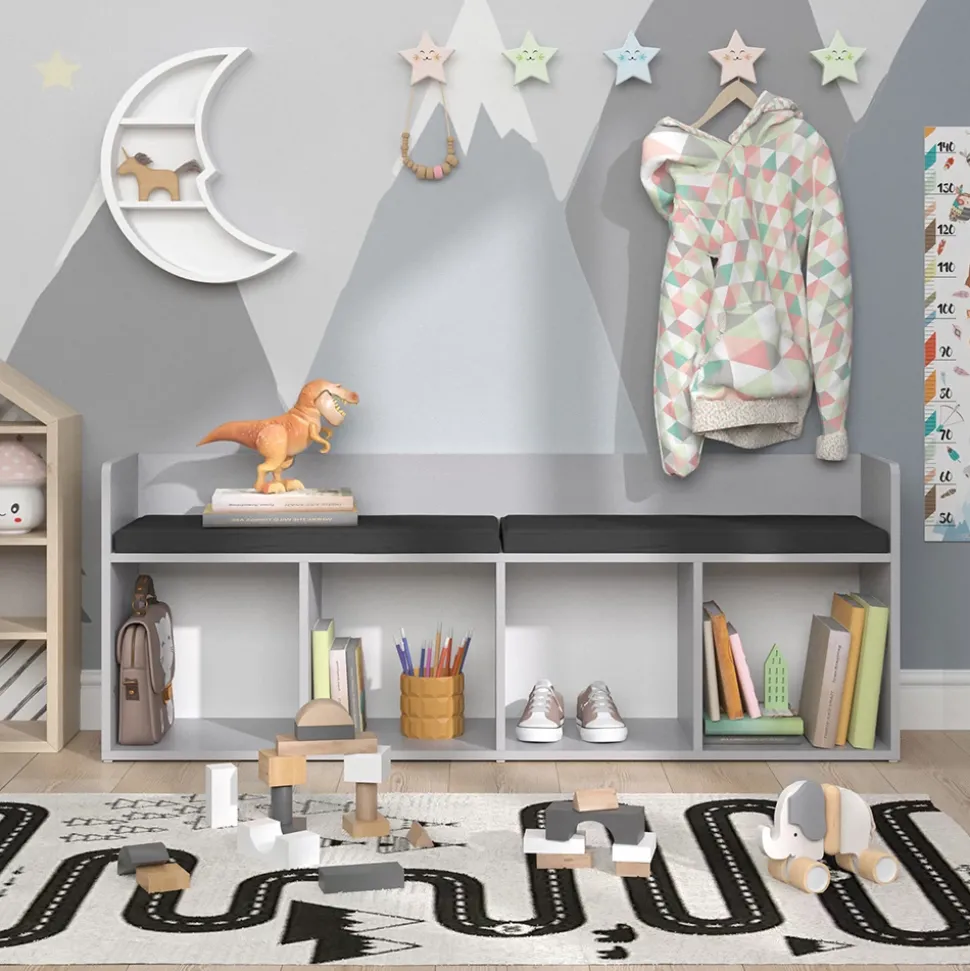 - Das Regal bietet ausreichend Platz, in dem Sie die Lieblingsstücke Ihrer Kinder oder unsere Faltboxen platzieren können. Die zusätzliche Sitzmöglichkeit wird Sie begeistern.