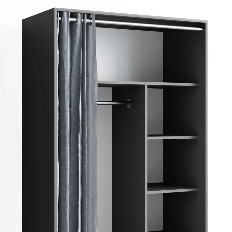 Egal ob Schlafzimmer, Kinderzimmer oder Flur – Doros lässt sich schnell und einfach an jeden beliebigen Ort rollen und bietet durch die diversen Fächer und der Kleiderstange viel Stauraum. Dank seines Vorhangs ermöglicht Ihnen der Schrank eine staubfreie und saubere Lagerung all Ihrer Kleidung. Möchten Sie Auflockerung und ein offenes Raumgefühl in Ihre vier Wände bringen, kann der Schrank auch ohne Vorhang aufgestellt werden.