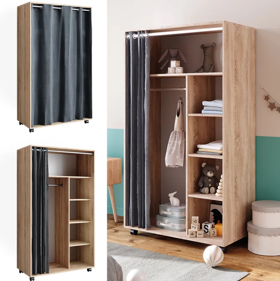 - Der Flügeltürenschrank verfügt über offene Regale, eine Aufhängestange und Laufrollen für Flexibilität und einfache Handhabung.