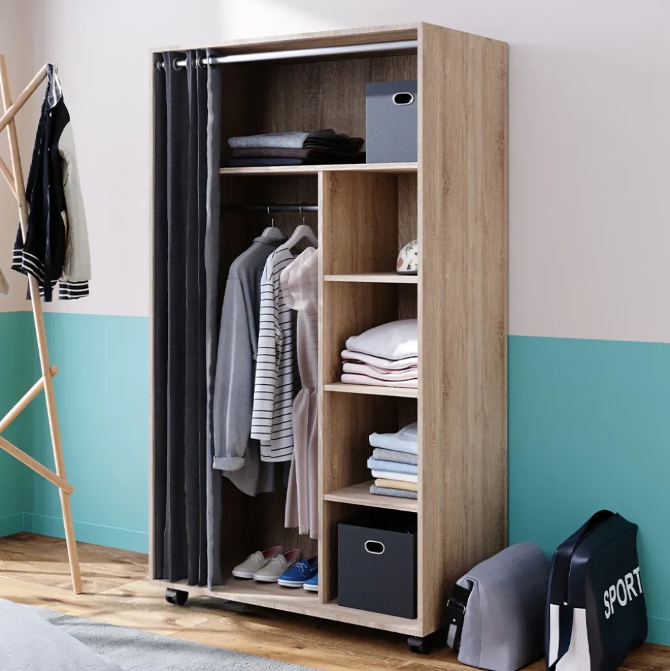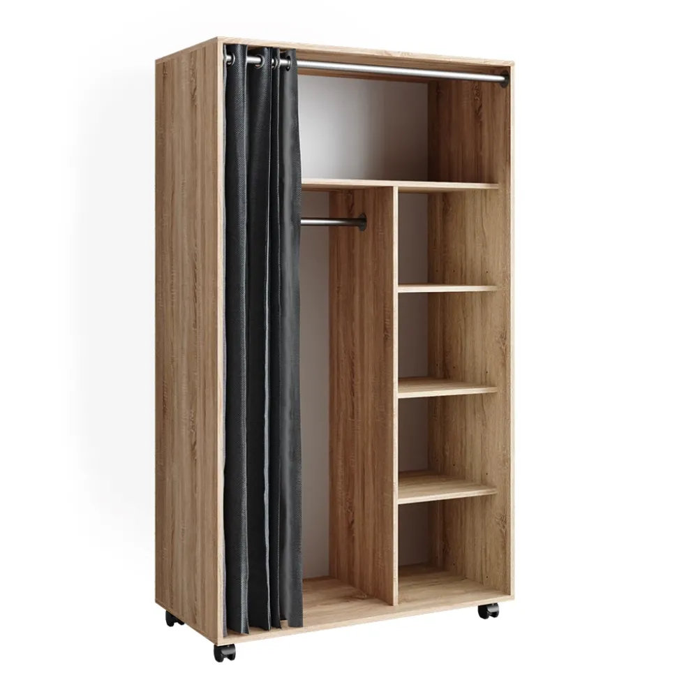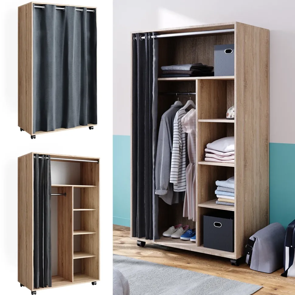 Egal ob Schlafzimmer, Kinderzimmer oder Flur – Doros lässt sich schnell und einfach an jeden beliebigen Ort rollen und bietet durch die diversen Fächer und der Kleiderstange viel Stauraum. Dank seines Vorhangs ermöglicht Ihnen der Schrank eine staubfreie und saubere Lagerung all Ihrer Kleidung. Möchten Sie Auflockerung und ein offenes Raumgefühl in Ihre vier Wände bringen, kann der Schrank auch ohne Vorhang aufgestellt werden.