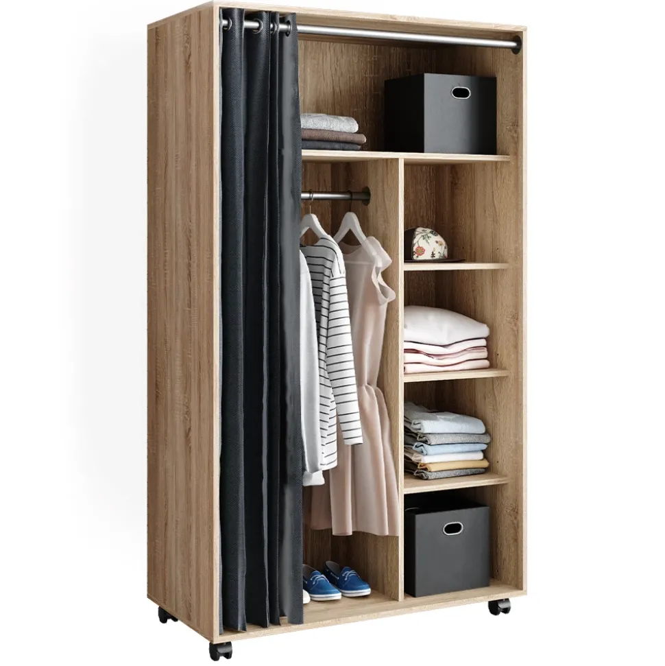 - Der Flügeltürenschrank verfügt über offene Regale, eine Aufhängestange und Laufrollen für Flexibilität und einfache Handhabung.
