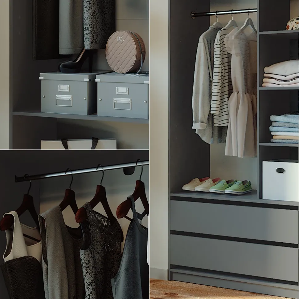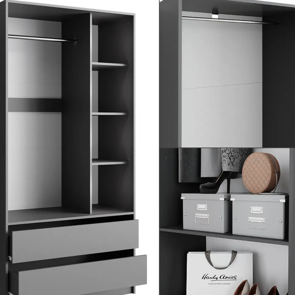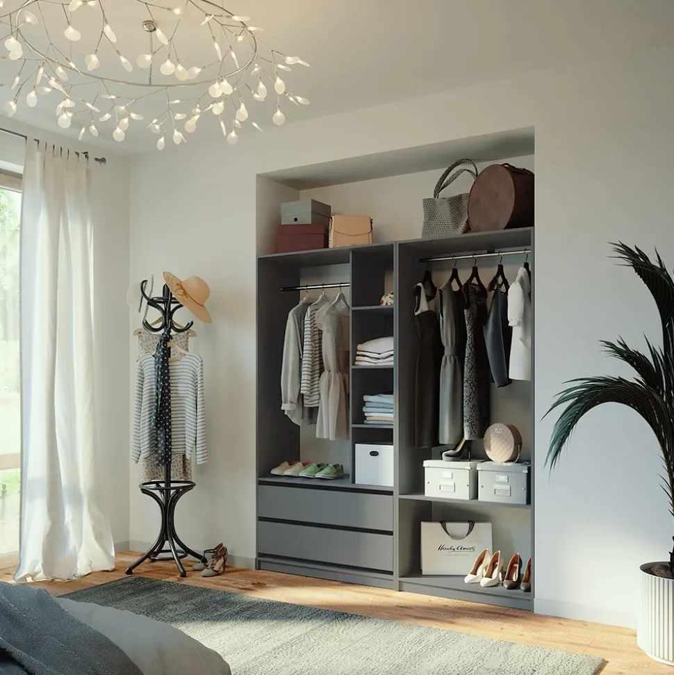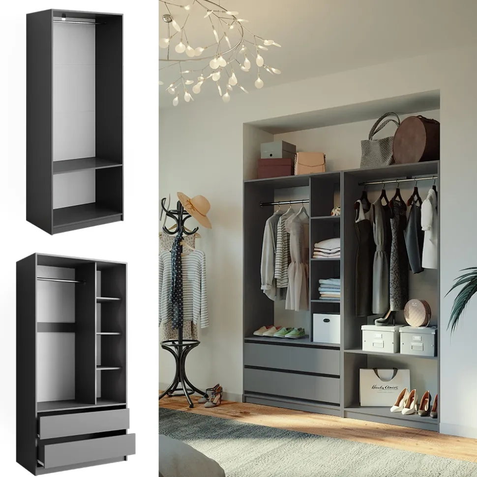 Elmo ist das perfekte Kleiderschrank-Set für jeden Raum. Mit dessen vielseitigen Einsatzmöglichkeiten als Mehrzweckschrank- oder Garderobenschrank-Set ist es nicht nur im Schlafzimmer einsetzbar, sondern auch als Wohnzimmerschrank-Kombi. Das offene Design mit Schubladen macht Elmo zu einem echten Hingucker. Es kann zudem problemlos mit anderen Möbelstücken kombiniert werden und passt sich somit jedem Einrichtungsstil an. Gönnen Sie sich jetzt den Luxus vom Elmo Möbel-Set und genießen Sie Ordnung und mehr Platz in Ihrem Zuhause.