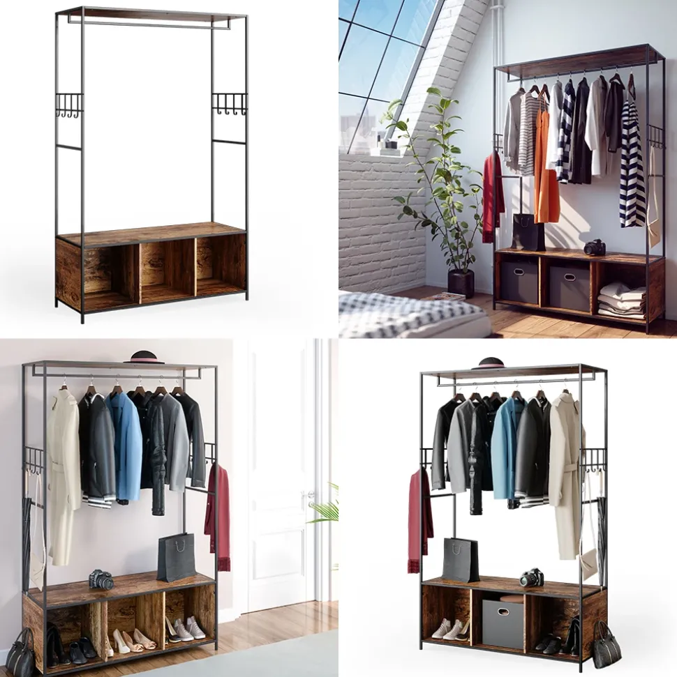 - Der Flügeltürenschrank bietet viel Stauraum durch offene Regale und Haken.