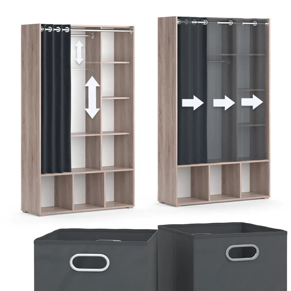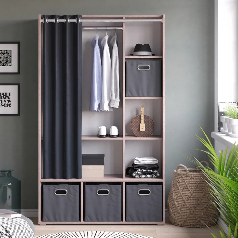 - Durch seine Melaminharzbeschichtung bietet unser Kleiderschrank Luigi eine pflegeleichte Oberfläche. Der Vorhang ist ebenfalls aus einem robusten Stoff gefertigt. Das zusätzlich enthaltene Faltboxen 4er-Set bietet ergänzenden Stauraum und ist ebenfalls sehr leicht in der Pflege.