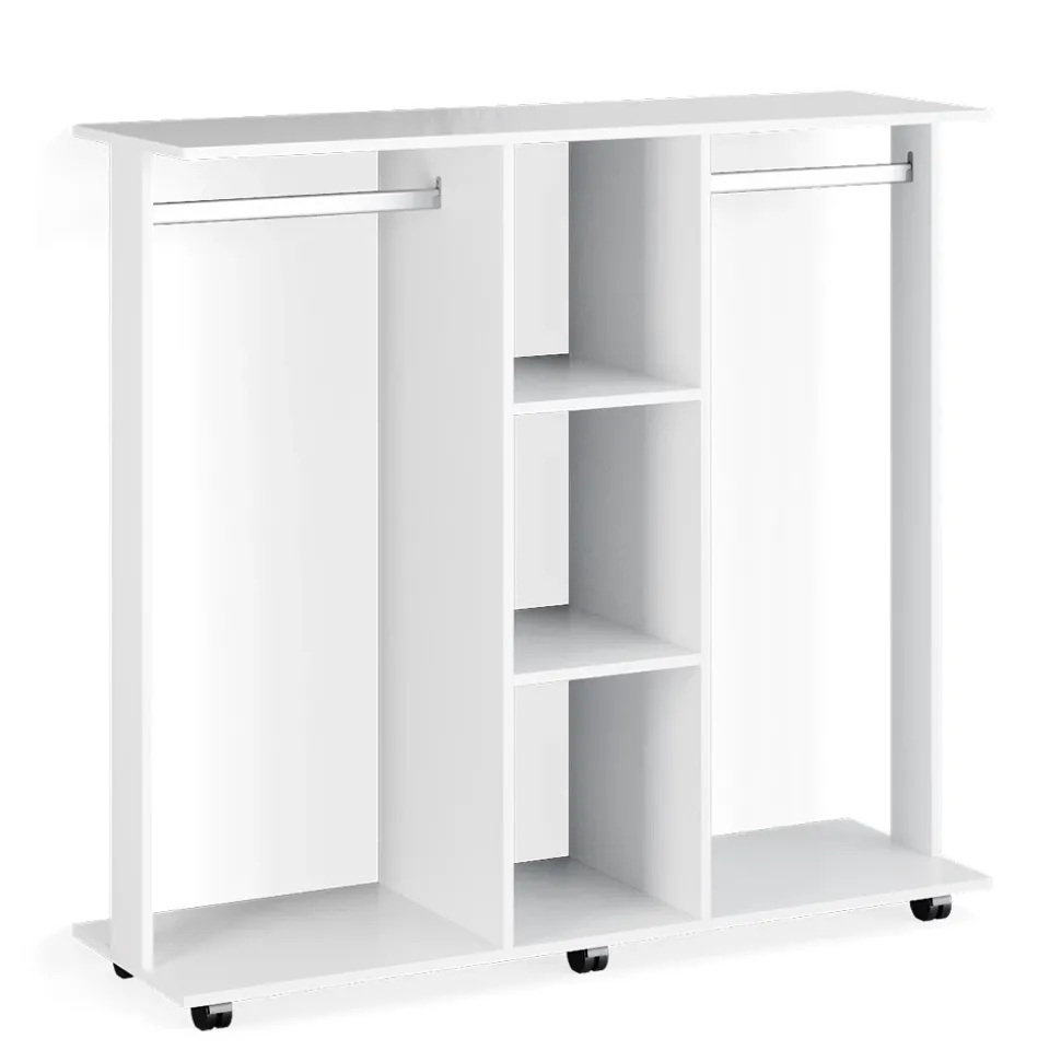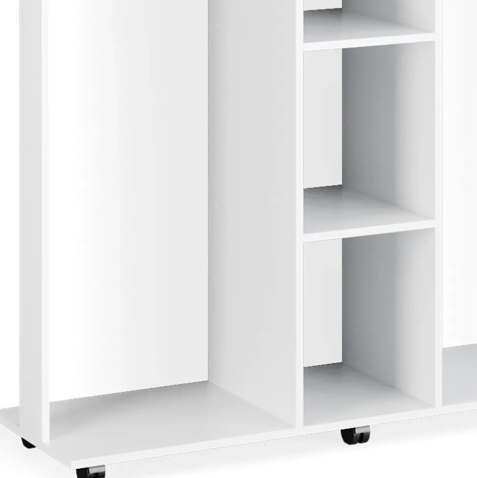 - Der Flügeltürenschrank bietet Mobilität auf Rädern und bietet praktische Ablagen mit reichlich Stauraum.