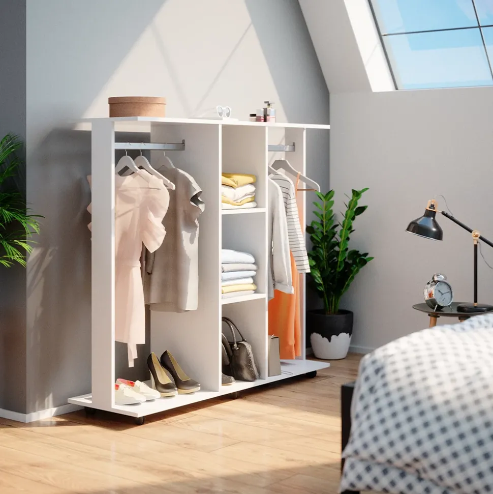 Der Kleiderschrank Robbie ist ein geräumiger und funktionaler Schrank für die Aufbewahrung von Kleidung und Accessoires. Mit seinem zeitlosen Design und den cleveren Organisationsmöglichkeiten bietet er eine optimale Lösung für die Ordnung und den Stil in Ihrem Schlafzimmer.