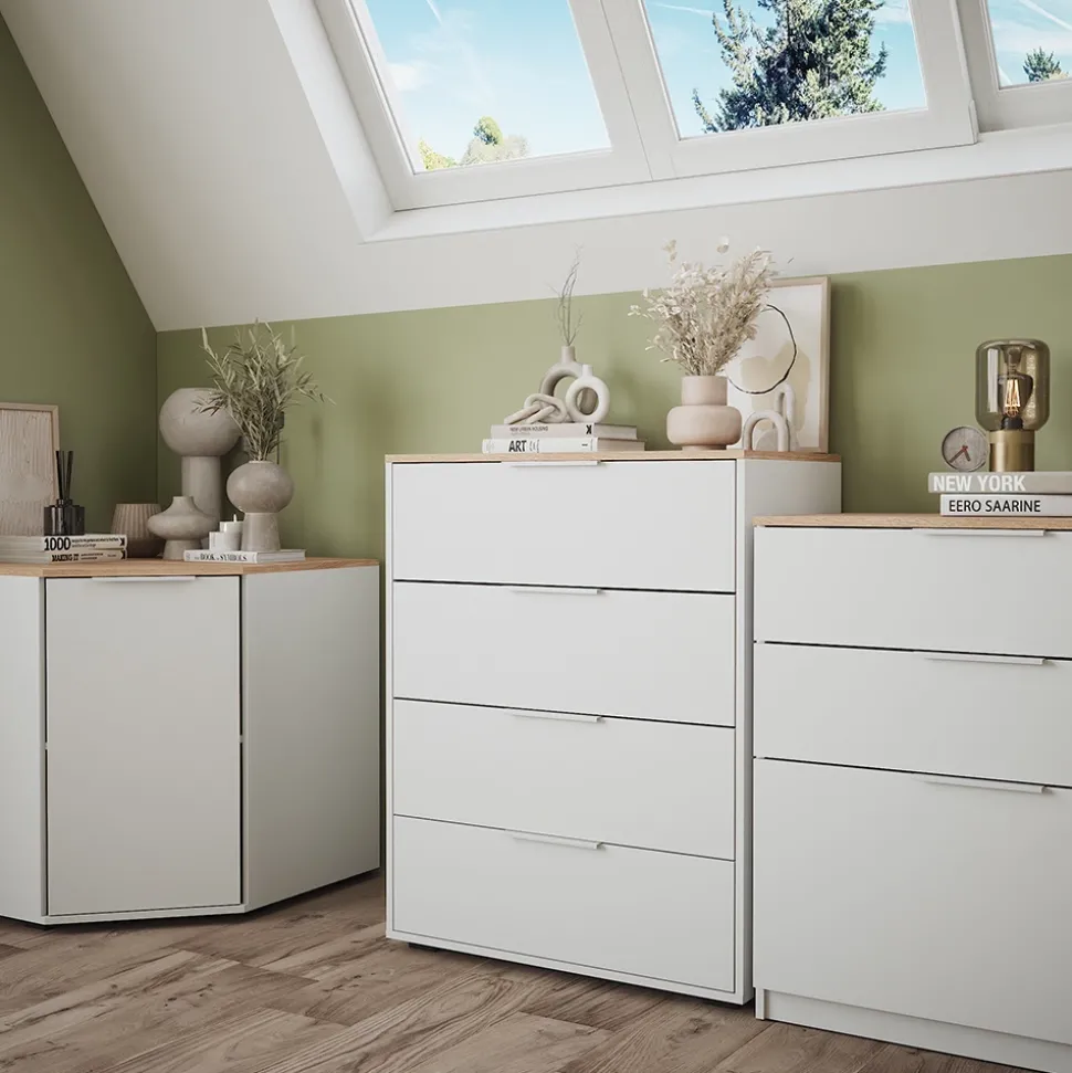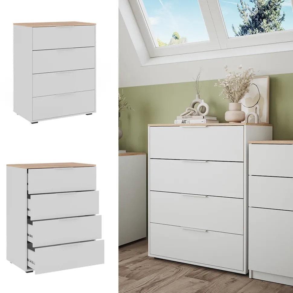 Die Kommode Betti bietet nicht nur praktischen Stauraum, sondern auch ein funktionelles und zeitloses Design für Ihr Schlafzimmer. Mit ihren 4 geräumigen Schubladen können Sie all Ihre Kleidung und Accessoires ordentlich verstauen und haben alles schnell zur Hand. Dank des modernen Aussehens der Kommode lässt sie sich zudem wunderbar mit anderen Möbelstücken kombinieren und gibt Ihrem Zuhause einen frischen Look. Mit der Kommode Betti können Sie Ihren vier Wänden nicht nur mehr Ordnung, sondern auch mehr Stil verleihen. Holen Sie sich jetzt dieses praktische Möbelstück und bringen Sie mehr Ordnung in Ihr Schlafzimmer!