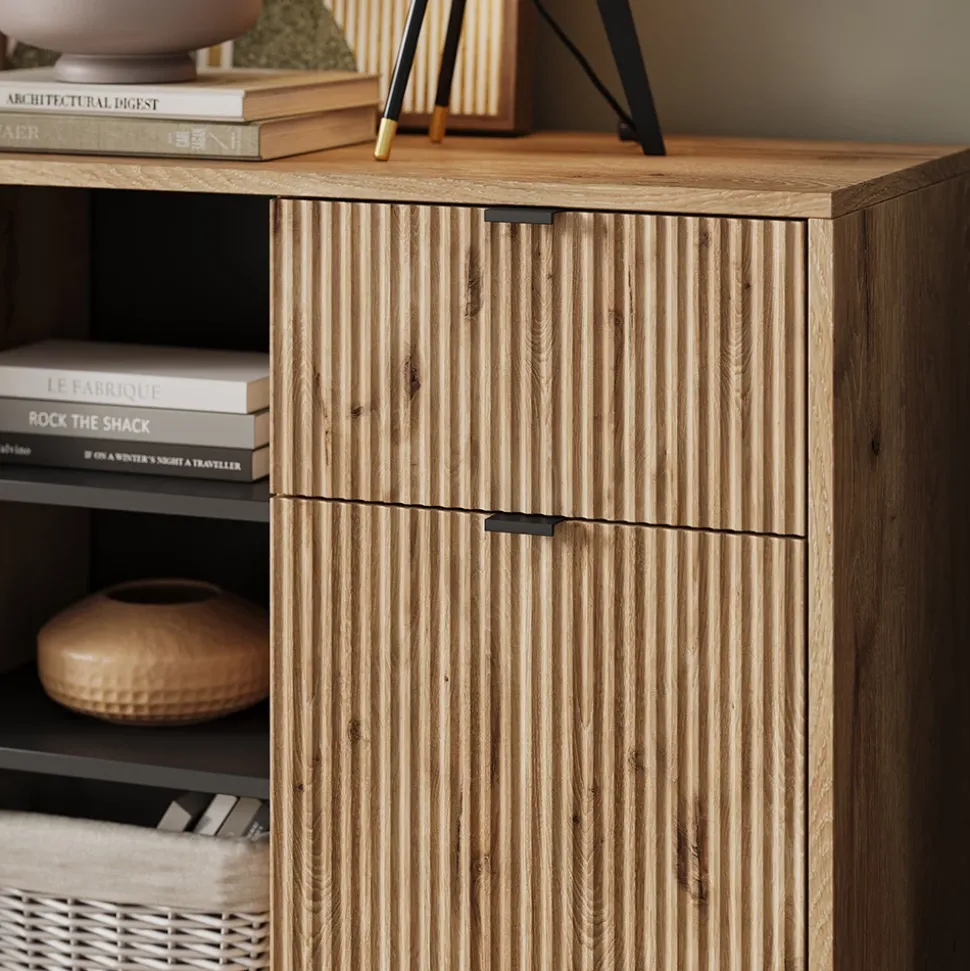 Die Kommode Eliza ist nicht nur ein einfacher Schubladenschrank, sondern ein echtes Multitalent. Mit ihrem modernen Design fügt sie sich nahtlos in jedes Wohnambiente ein und bietet dabei viel Stauraum für all Ihre Habseligkeiten. Dank der funktionalen Aufteilung eignet sich die Kommode perfekt als Sideboard oder Anrichte. Zudem ist sie platzsparend und lässt sich wunderbar mit anderen Artikeln der Eliza Serie kombinieren. Geben Sie Ihrem Schlafzimmer mit der Kommode Eliza ein stilvolles Upgrade und erleben Sie, wie praktisch und schön Ordnung sein kann.