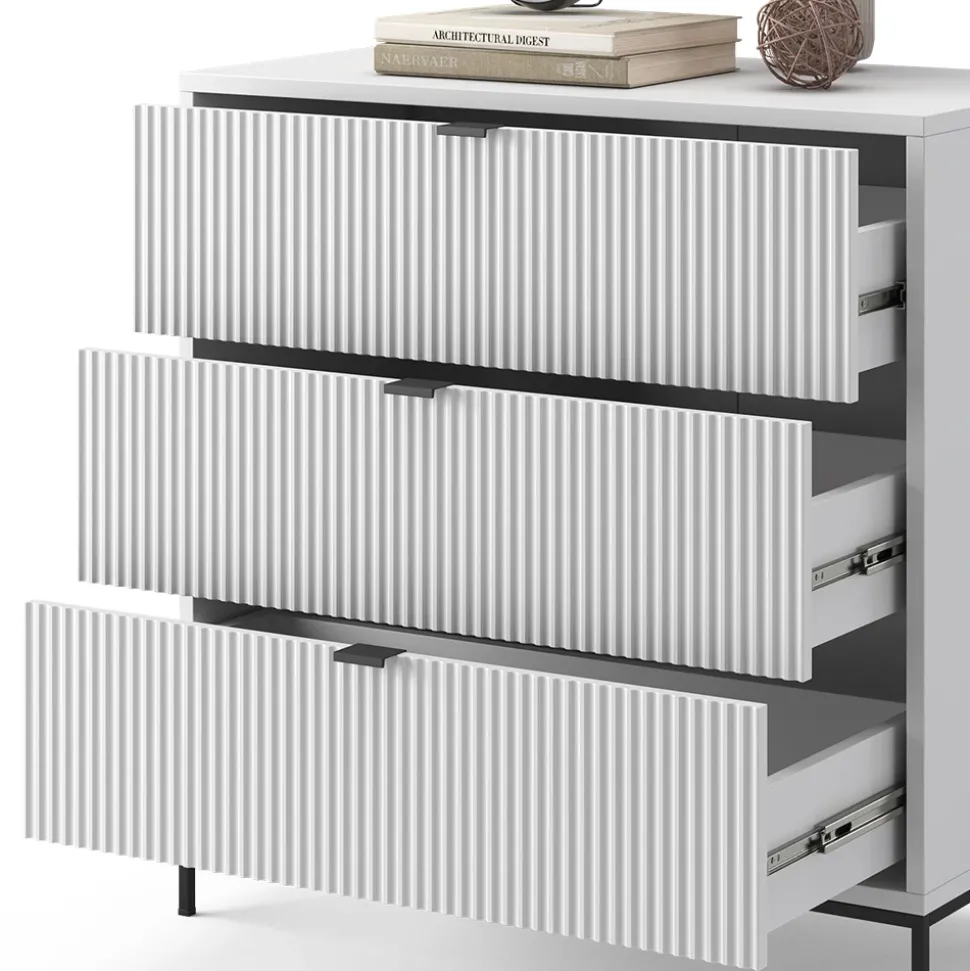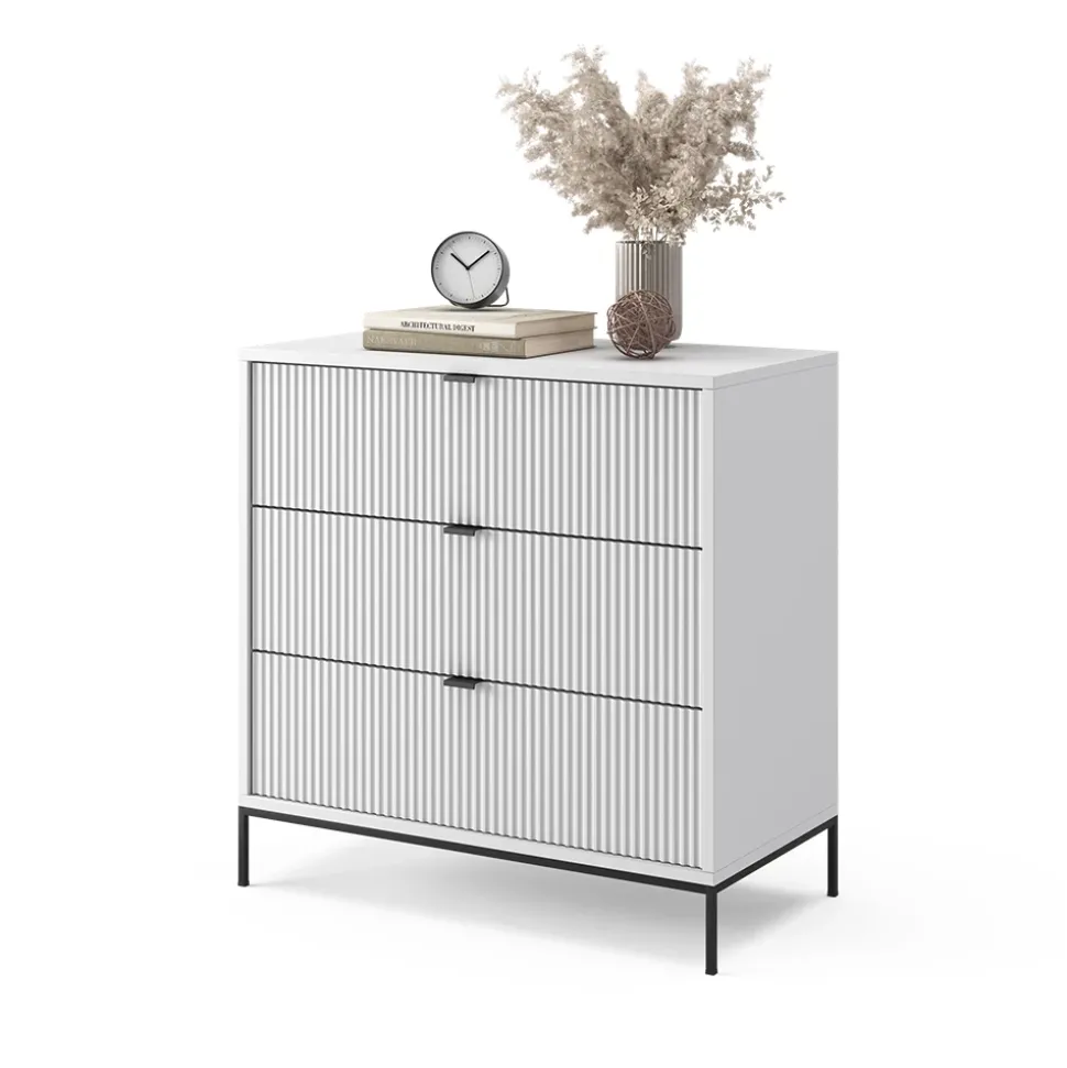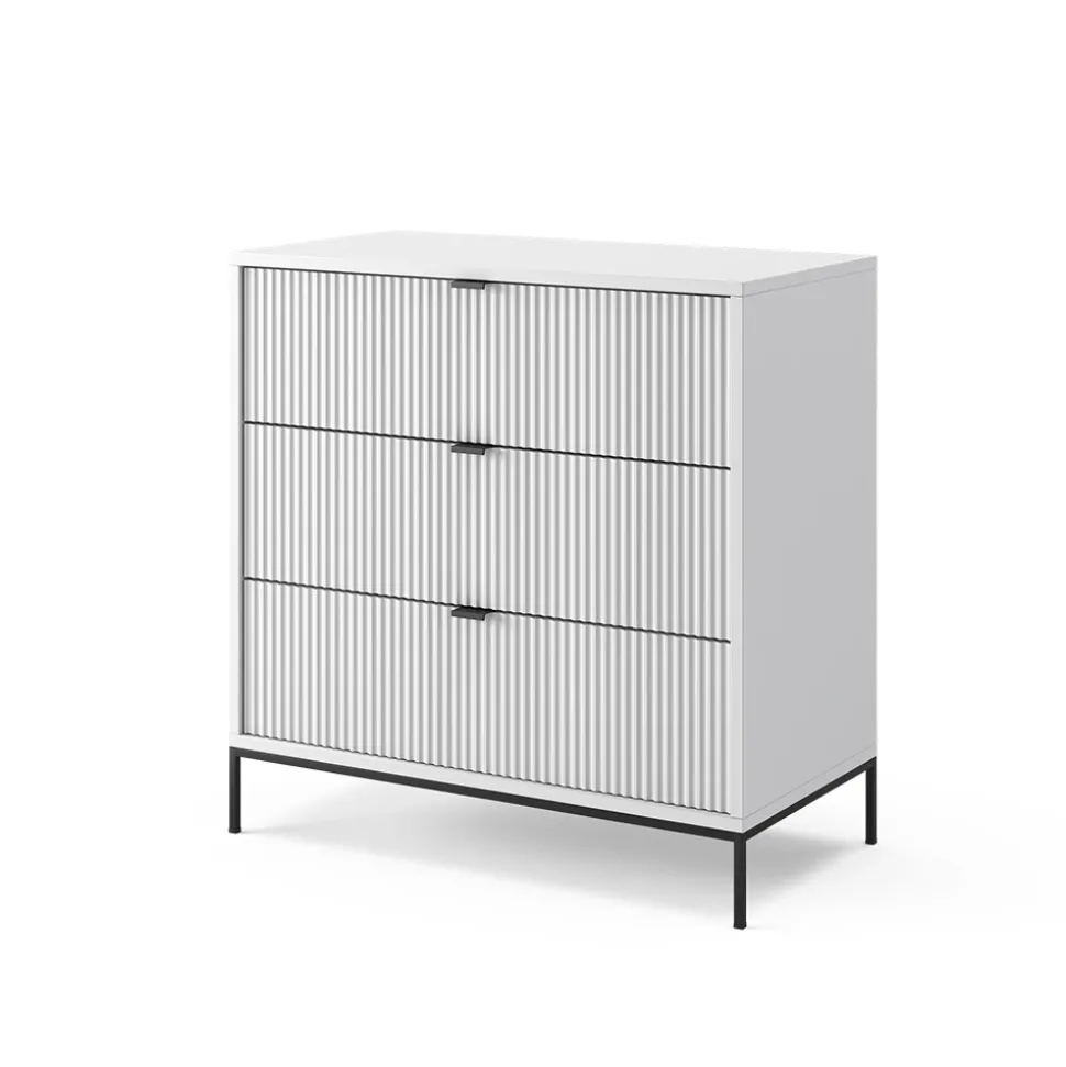 Die Kommode Eliza besticht durch ihr zeitgemäßes Design, welches sich harmonisch in jeden Wohn- oder Schlafraum einfügt. Mit drei geräumigen Schubladen bietet die Kommode ausreichend Platz, um persönliche Gegenstände ordentlich zu verstauen. Die Oberfläche der Kommode ist besonders pflegeleicht und lässt sich mühelos sauber halten, sodass sie lange Zeit wie neu aussieht. Die Kommode ist Teil der eleganten Möbelserie Eliza, die eine harmonische Einrichtung des gesamten Raums ermöglicht.