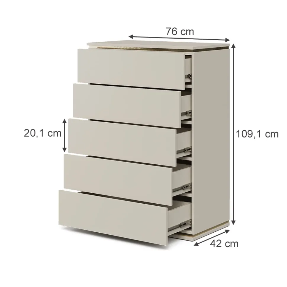 - MAßE: Das Sideboard mit 5 Schubladen hat folgende Abmessungen: Tiefe: 42 cm, Breite: 76 cm, Höhe: 109,1 cm. Die detaillierten Maße sind auf den Fotos angegeben.