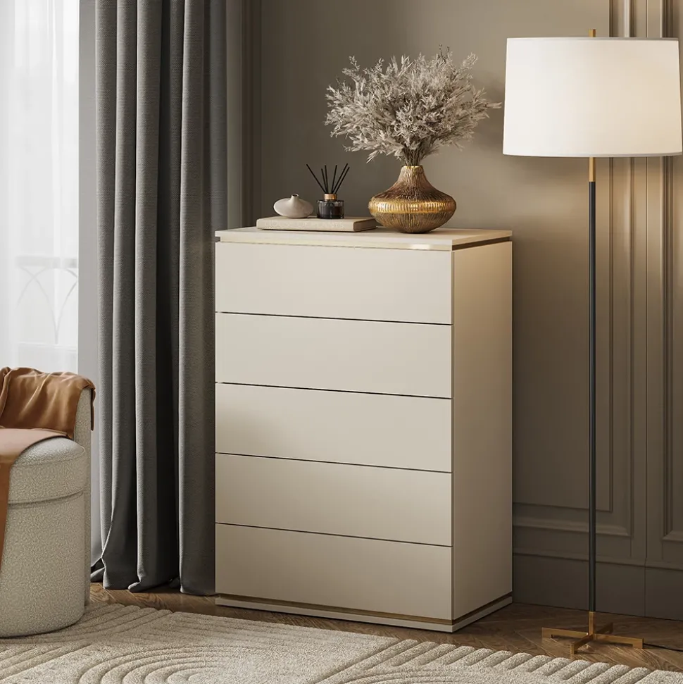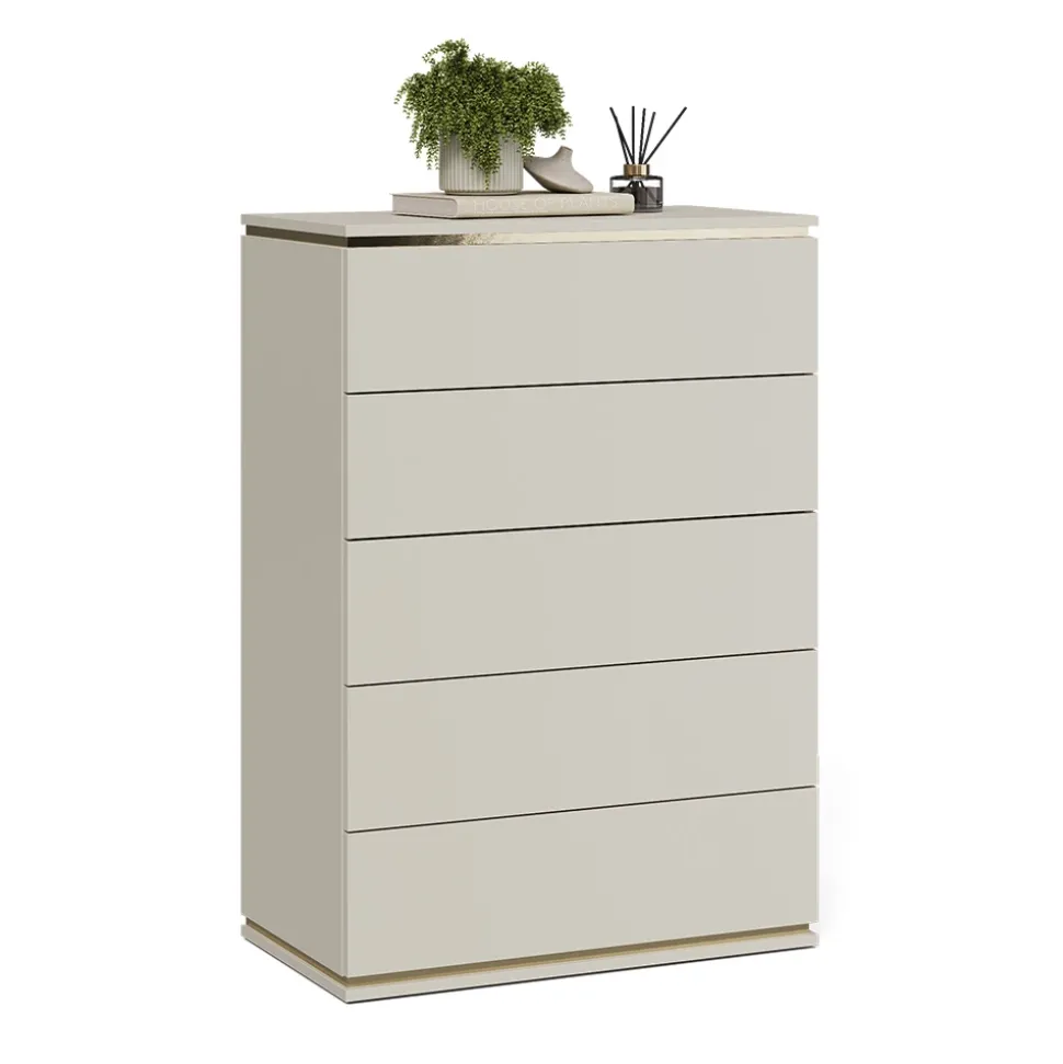 Die Kommode Linette ist nicht nur ein praktisches Möbelstück, sondern auch ein echter Blickfang für Ihr Schlafzimmer. Mit fünf geräumigen Schubladen bietet sie ausreichend Stauraum für Kleidung, Bettwäsche und andere Dinge, die Sie ordentlich verstauen möchten. Dank der Push-to-open Funktion lassen sich die Schubladen mühelos öffnen und schließen. Die Kommode passt perfekt zu anderen Möbeln der Linette-Serie und sorgt somit für ein harmonisches Gesamtbild in Ihrem Zuhause. Holen Sie sich mit der Kommode Linette nicht nur Funktionalität, sondern auch Stil in Ihr Schlafzimmer!