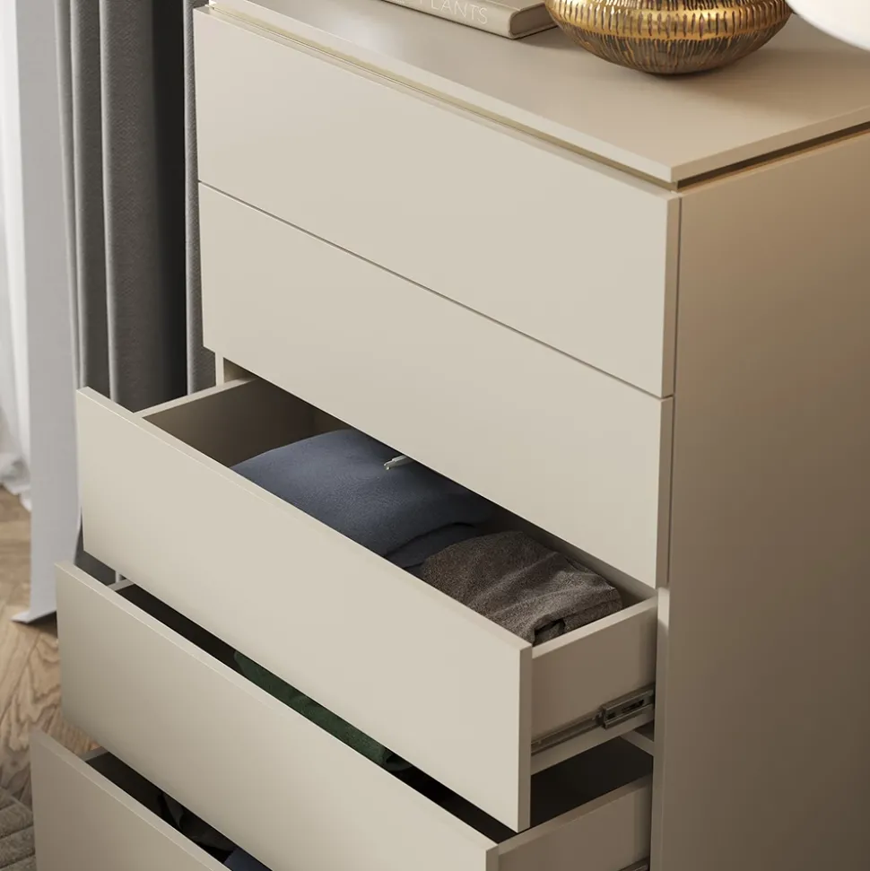 - Die fünf Schubladen öffnen dank Push-to-Open grifflos per Fingertipp – der Kommodenschrank setzt auf cleanes Design und passt perfekt in jedes Zimmer.