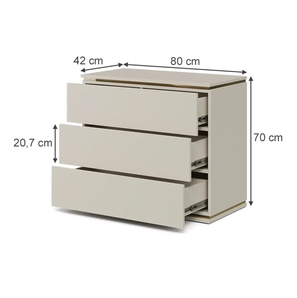 Die Kommode Linette ist nicht nur ein praktisches Möbelstück für Ihr Schlafzimmer, sondern auch ein echter Hingucker in Ihrem Zuhause. Mit drei geräumigen Schubladen und großem Stauraum bietet sie ausreichend Platz für Ihre Kleidung, Accessoires oder persönlichen Gegenstände. Die Push-to-open Funktion macht das Öffnen und Schließen der Schubladen besonders einfach und komfortabel. Die Kommode passt perfekt zu anderen Möbeln der Linette-Serie und lässt sich somit optimal in Ihr bereits bestehendes Mobiliar integrieren. Bringen Sie mit der Kommode Linette Ordnung und Stil in Ihr Schlafzimmer!