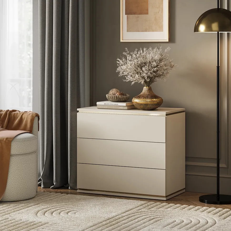 Die Möbelserie Linette umfasst eine elegante Nachtkommode, die Funktionalität und zeitloses Design vereint