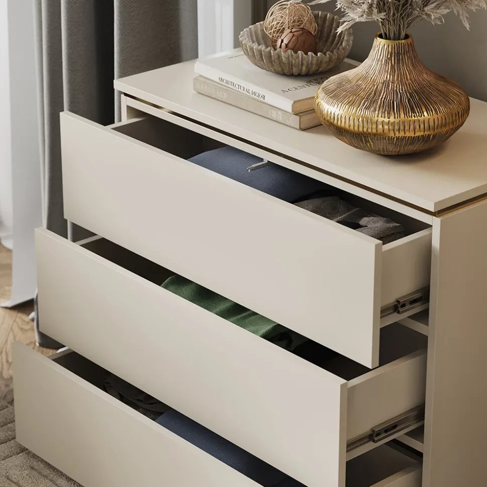 - Die drei Schubladen öffnen dank Push-to-Open grifflos per Fingertipp – der Kommodenschrank setzt auf cleanes Design und passt perfekt in jedes Zimmer.