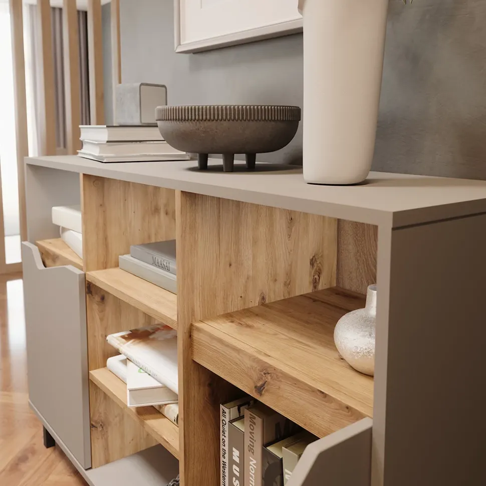 Die Kommode Marelle ist nicht nur ein praktisches Möbelstück für Ihr Zuhause, sondern auch ein echtes Stauraumwunder. Mit seinem Sideboard-Design und den Regalen mit Türen bietet es genügend Platz, um all Ihre Habseligkeiten ordentlich zu verstauen. Der Kommodenschrank ist nicht nur funktional, sondern verleiht Ihrem Wohnraum auch eine elegante Note. Stellen Sie sich vor, wie Sie beim Öffnen der Türen Ihre Lieblingsstücke ordentlich geordnet vorfinden und wie die Marelle Kommode Ihr Zuhause in neuem Glanz erstrahlen lässt. Gönnen Sie sich dieses Möbelstück und machen Sie Ihr Zuhause noch gemütlicher und einladender.