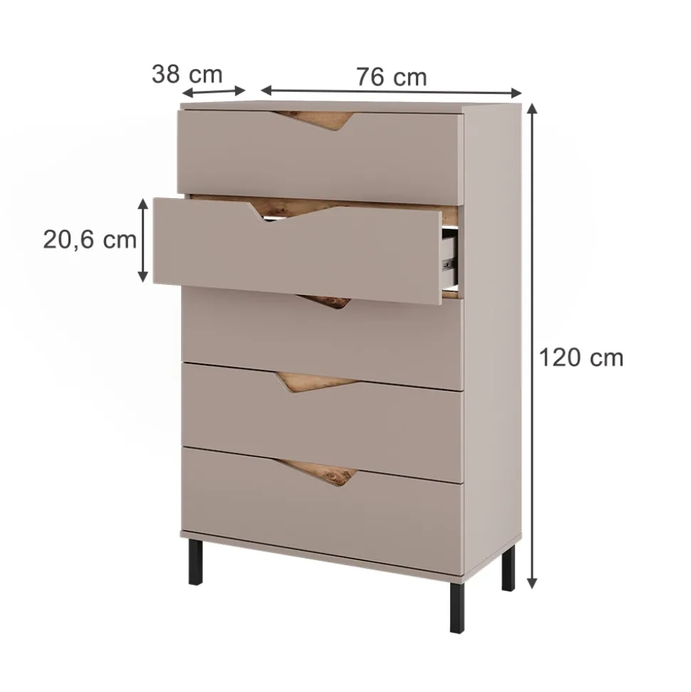 - MAßE: Das Sideboard mit 5 Schubladen hat folgende Abmessungen: Breite: 76 cm, Höhe: 120 cm, Tiefe: 38 cm. Die detaillierten Größen sind auf den Bildern ersichtlich.