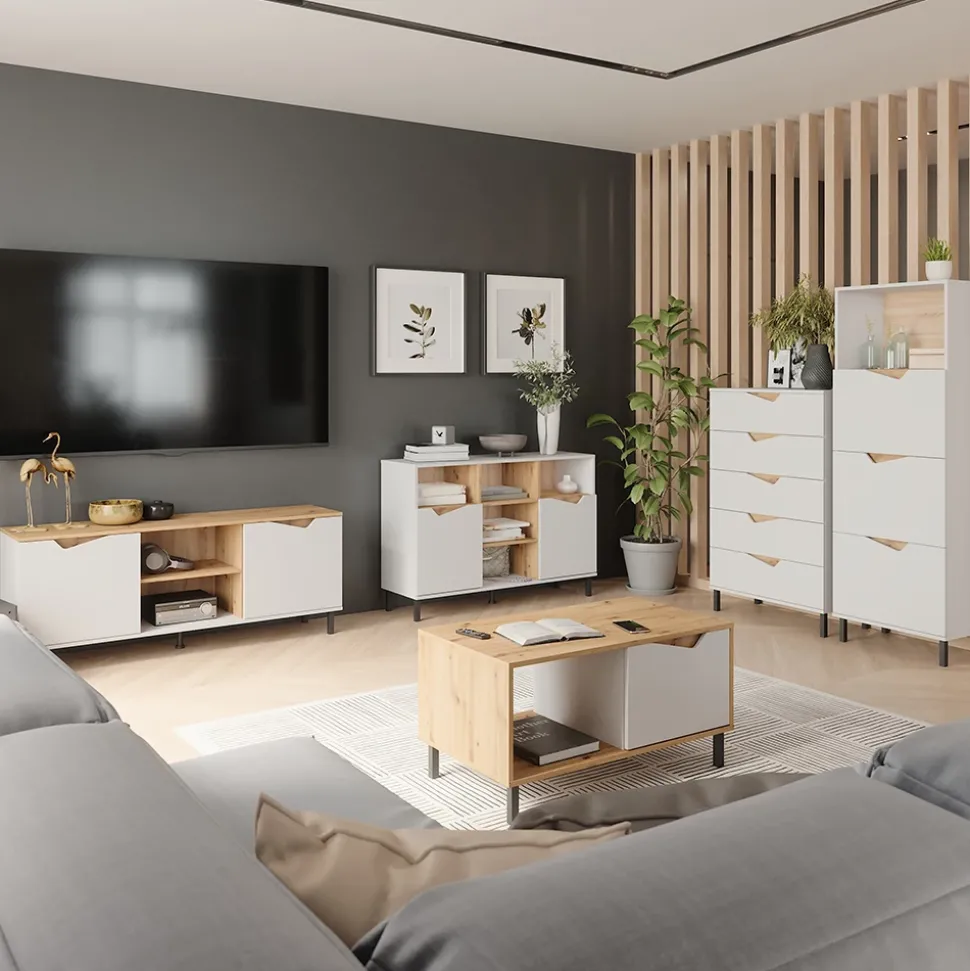 Die Kommode Marelle ist nicht nur ein einfacher Kommodenschrank, sondern ein praktisches Möbelstück, das Ihr Zuhause auf stilvolle Weise organisiert. Mit geräumigen Ablagen und Türen bietet diese Kommode ausreichend Stauraum für Ihre persönlichen Gegenstände. Ihr modernes Design fügt sich nahtlos in jede Einrichtung ein und verleiht Ihrem Raum eine elegante Note. Stellen Sie sich vor, wie ordentlich und aufgeräumt Ihr Wohnzimmer mit der Kommode Marelle aussehen würde – ein echter Blickfang für Ihre Gäste und ein praktisches Möbelstück für Sie! Gönnen Sie sich den Luxus von Komfort und Stil mit der Kommode Marelle.