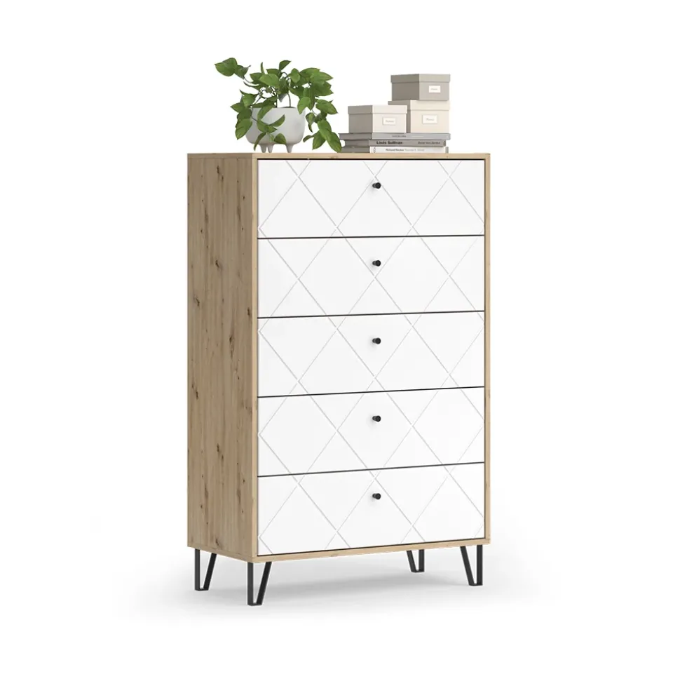 - Stilvolle Anrichte mit fünf geräumigen Schubladen – ideal für Kleidung, Dokumente oder Alltagsgegenstände, sorgt für viel Stauraum und Ordnung.