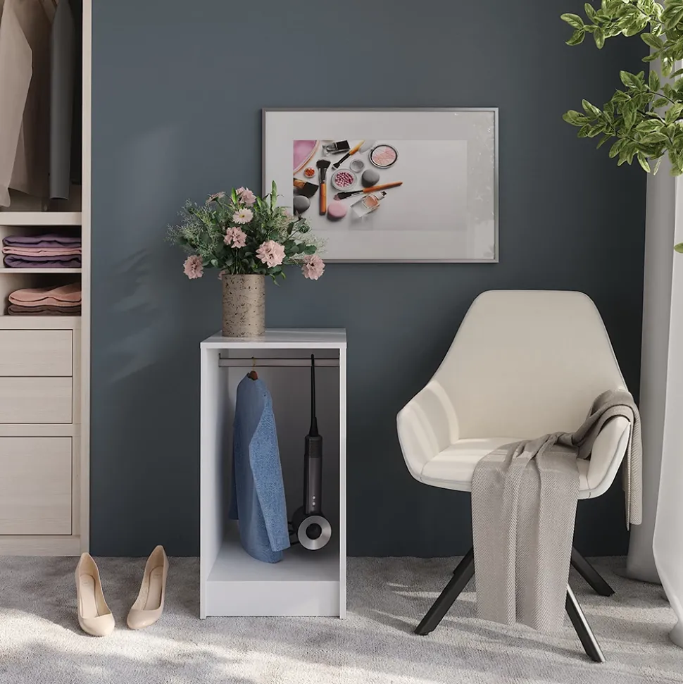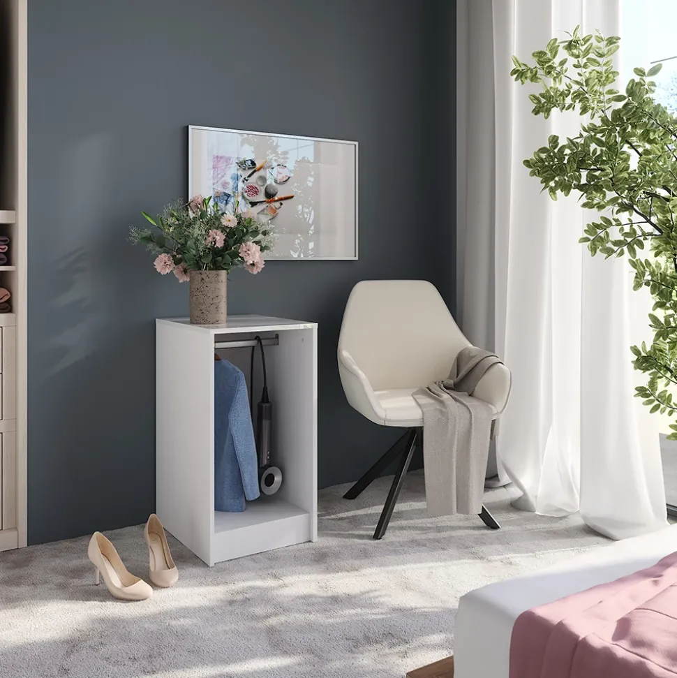 - Die Kommode bietet mit einer integrierten Kleiderstange optimalen Stauraum und fügt sich durch ihr modernes Design nahtlos in jedes Zimmer ein.