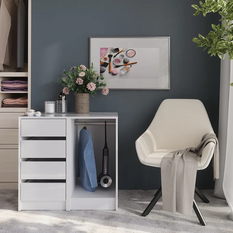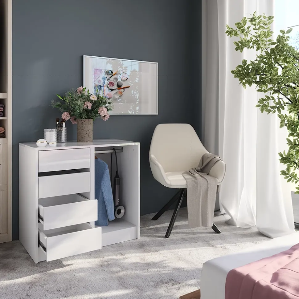 - Die Kommode bietet dir mit ihren praktischen Schubladen und einer Kleiderstange vielseitige Aufbewahrungsmöglichkeiten. Ihr modernes Design passt perfekt in jedes Zuhause.