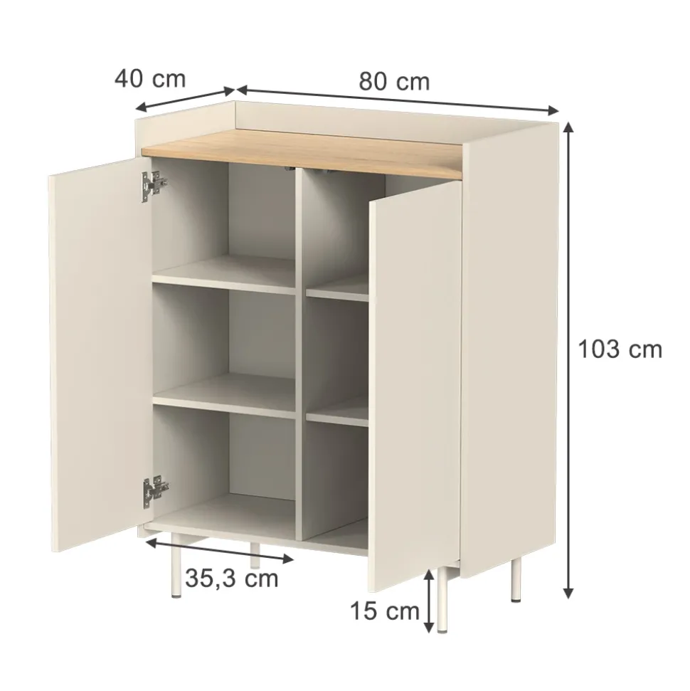 - MAßE: Das Sideboard hat folgende Abmessungen: Tiefe: 40 cm, Breite: 80 cm, Höhe: 103 cm. Die detaillierten Größen sind auf den Fotos angegeben.