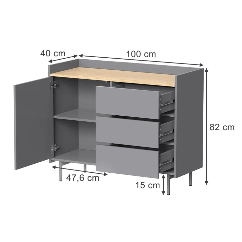 - MAßE: Das Sideboard hat folgende Abmessungen: Breite: 100 cm, Höhe: 82 cm, Tiefe: 40 cm. Die detaillierten Größen sind auf den Fotos angegeben.
