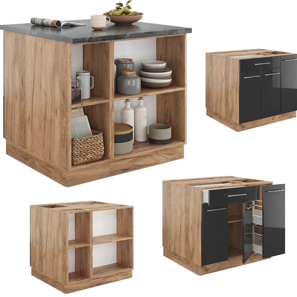 LIEFERUMFANG: Kücheninsel (Sofern nicht anders angegeben, gehören die Arbeitsplatten, Elektrogeräte und Dekoration nicht zum Lieferumfang), Montageanleitung, Montagematerial