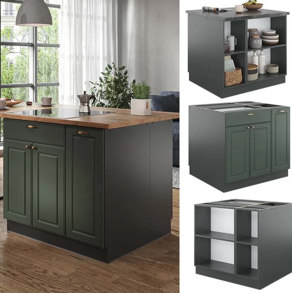 - MAßE: Der Insel-Küchenschrank hat eine Breite von 90 cm, eine Höhe von 82 cm und eine Tiefe von 82 cm. Alle detaillierten Größen sind auf den Fotos angegeben.
