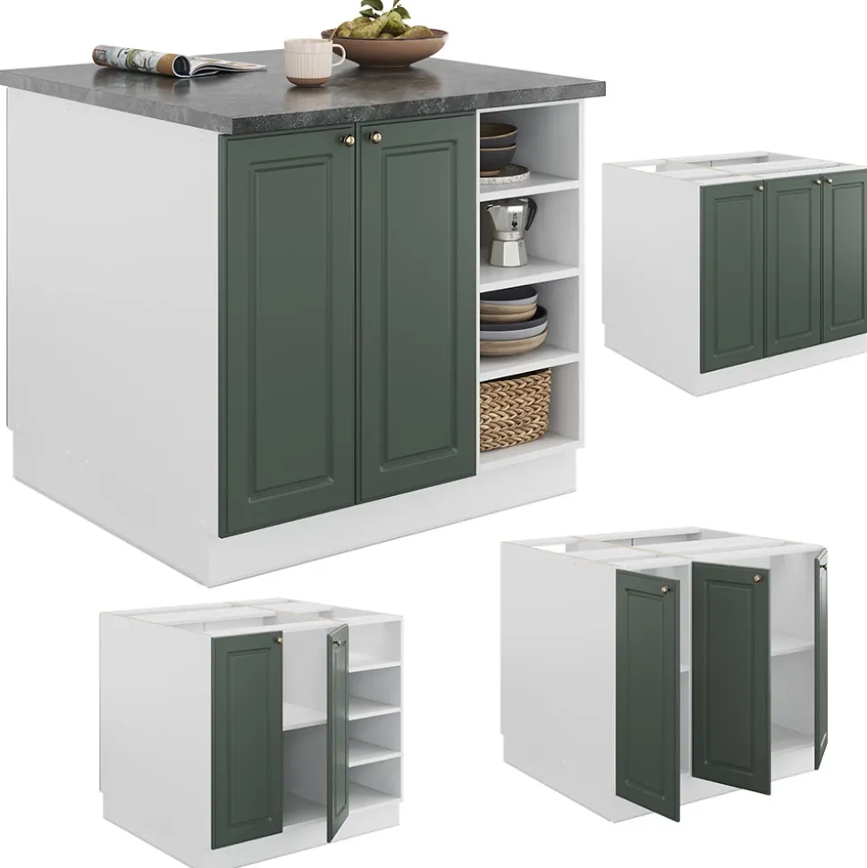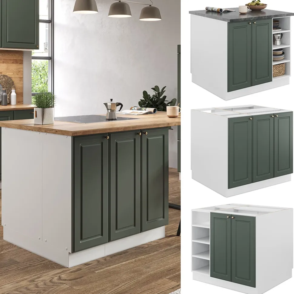 LIEFERUMFANG: Kücheninsel (Sofern nicht anders angegeben, gehören die Arbeitsplatten, Elektrogeräte und Dekoration nicht zum Lieferumfang), Montageanleitung, Montagematerial