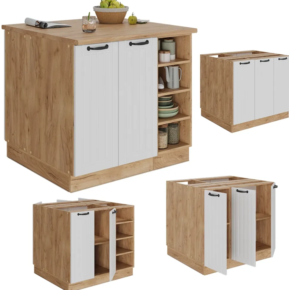 LIEFERUMFANG: Kücheninsel (Sofern nicht anders angegeben, gehören die Arbeitsplatten, Elektrogeräte und Dekoration nicht zum Lieferumfang), Montageanleitung, Montagematerial