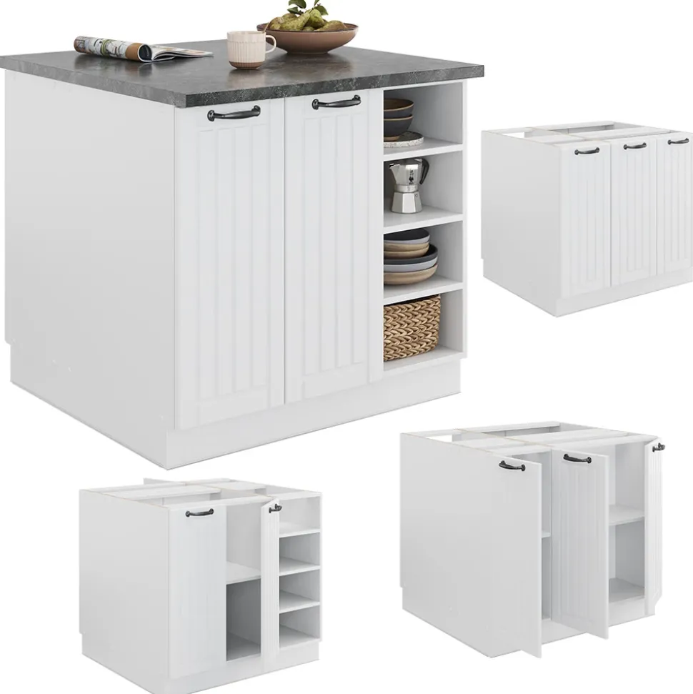 LIEFERUMFANG: Kücheninsel (Sofern nicht anders angegeben, gehören die Arbeitsplatten, Elektrogeräte und Dekoration nicht zum Lieferumfang), Montageanleitung, Montagematerial