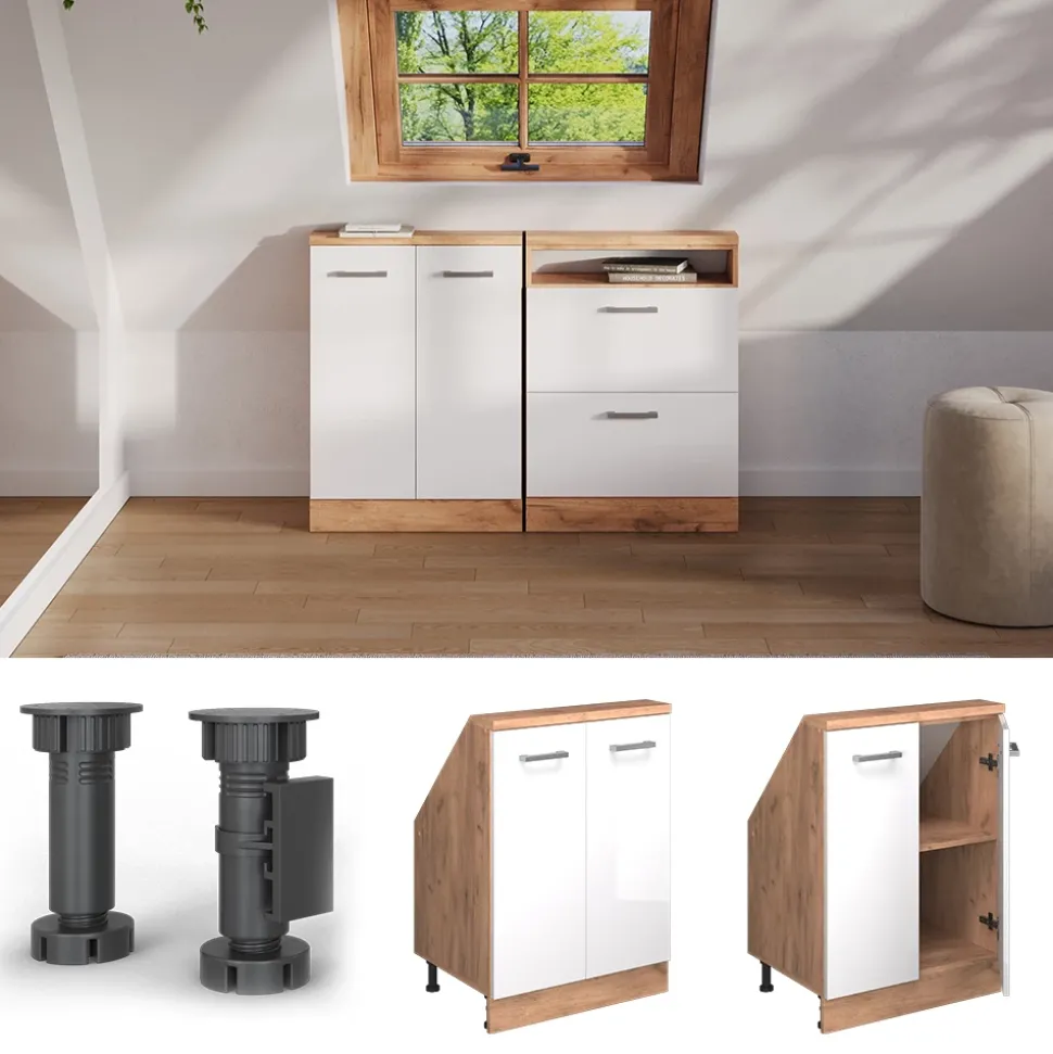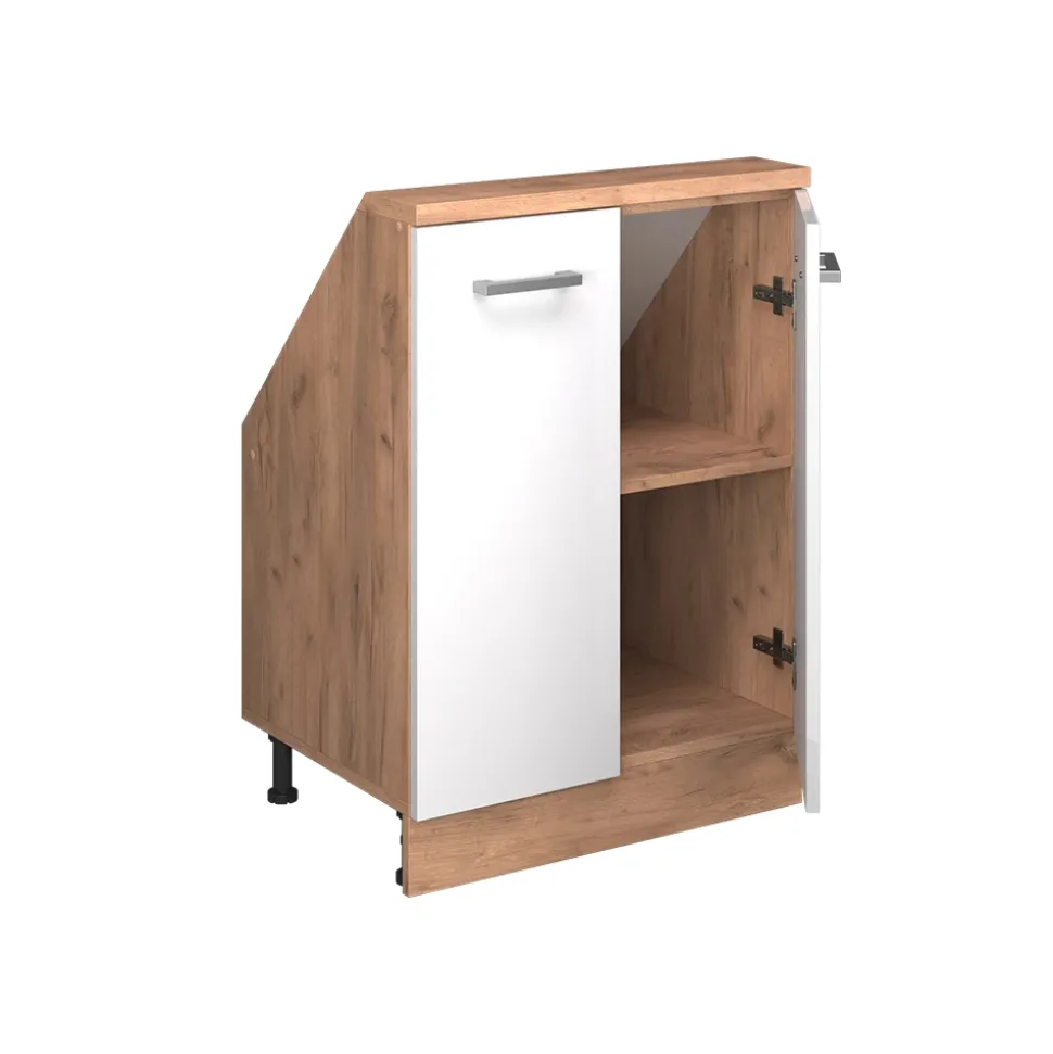 - Robuster Küchenschrank für Dachschrägen mit 2 Türen. Praktische Griffe und viel Stauraum machen ihn zu einer platzsparenden, langlebigen Lösung für Ihre Küche.