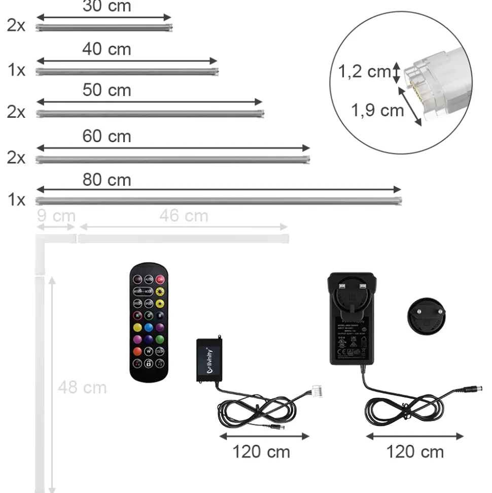 - Dieser LED-Streifen bietet RGB-Farben sowie einen separaten Beleuchtungsmodus in Warmweiß. Mit Schrauben und Klebeband zur einfachen Befestigung.