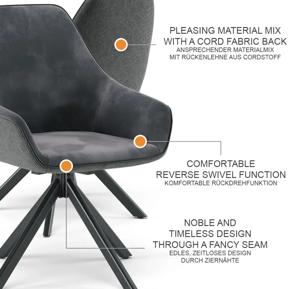 - MATERIAL: Der Drehstuhl besteht aus einem Materialmix aus Cord und Samt, welcher pflegeleicht ist. Das Stahlrohr ist pulverbeschichtet für eine lange Haltbarkeit.