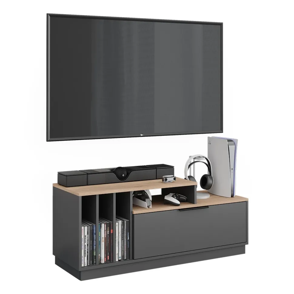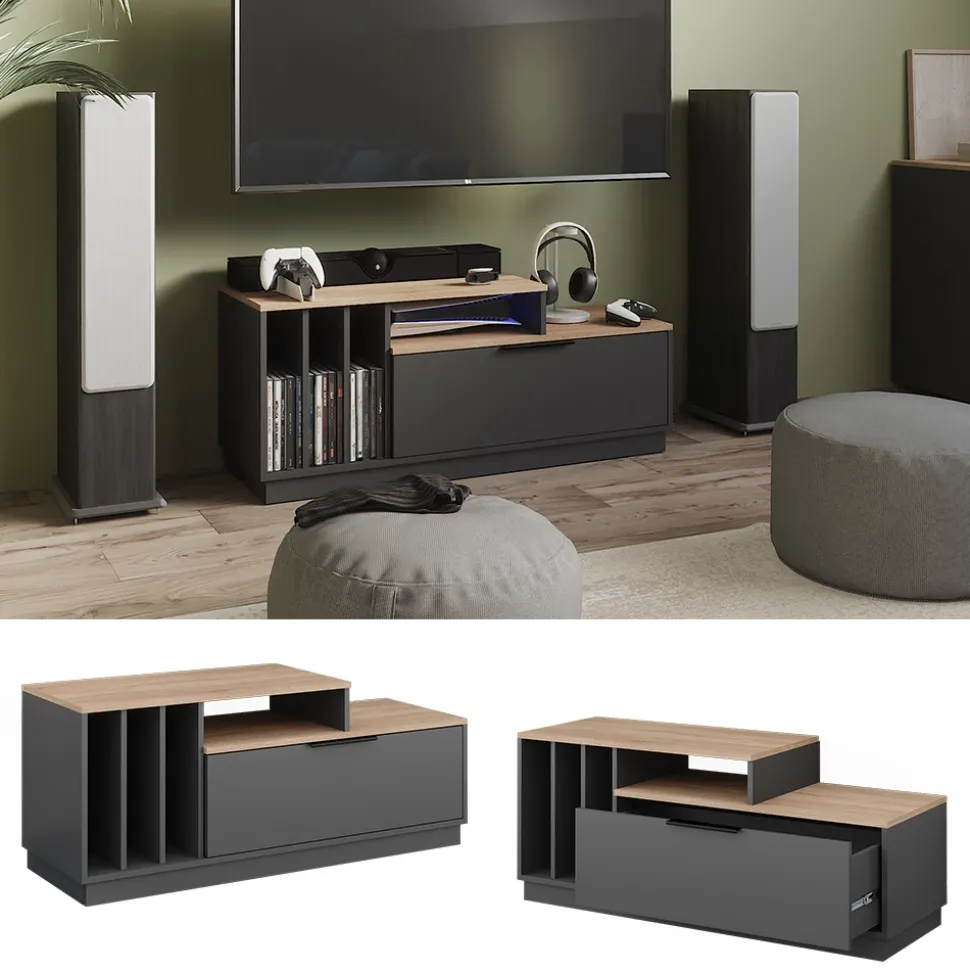 - Der Fernsehtisch verfügt über eine ausziehbare Schublade und vier Fächer für die Aufbewahrung Schallplatten oder Vinyl . Sein modernes Design passt perfekt in jedes Wohnzimmer.