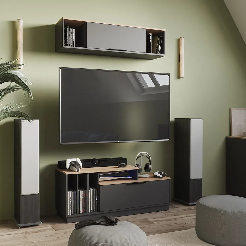 - MAßE: Der TV Schrank hat eine Tiefe von 40 cm, eine Breite von 120 cm und eine Höhe von 49,9 cm.