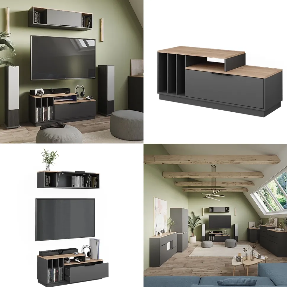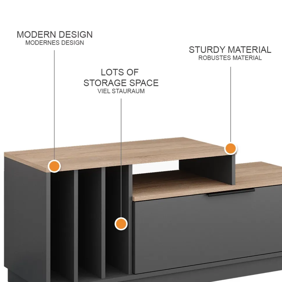 - MATERIAL: Das TV-Board besteht aus pflegeleichter, melaminharzbeschichteter 16 mm Spanplatte. Der Griff ist aus Kunststoff.
