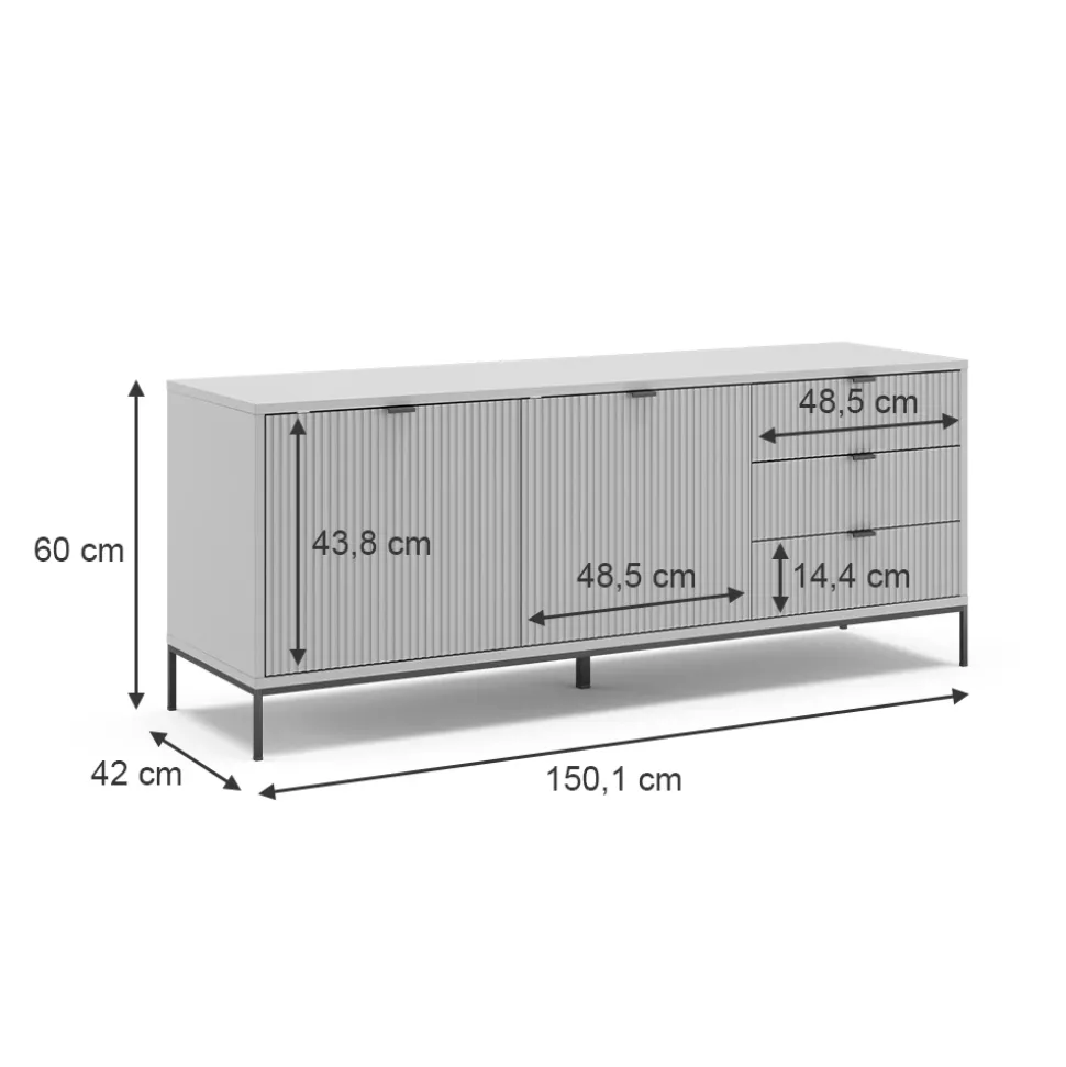 - MAßE: Der TV Schrank hat folgende Abmessungen: Breite: 150,1 cm, Höhe: 60 cm, Tiefe: 42 cm. Alle detaillierten Größen sind auf den Fotos angegeben.
