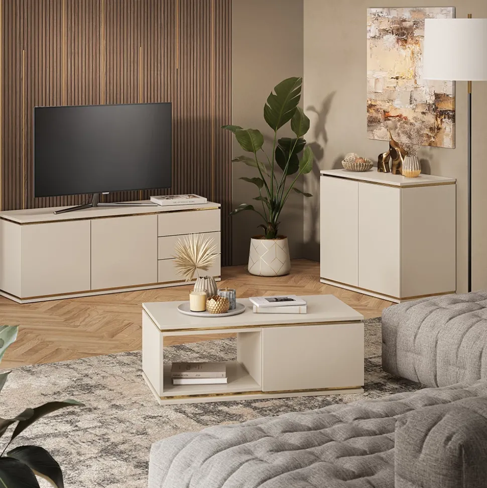 Das Lowboard Linette ist nicht nur ein funktionelles Möbelstück für Ihren Fernseher, sondern auch ein echter Blickfang in Ihrem Wohnzimmer. Mit seinen 2 Türen und 3 Schubladen bietet es ausreichend Stauraum für Ihre DVDs, Spiele und Fernbedienungen. Die Push-to-Open Funktion sorgt für ein modernes und elegantes Design. Kombinieren Sie das TV-Board mit anderen Möbeln der Linette-Serie, um Ihrem Wohnzimmer einen einheitlichen Look zu verleihen. Holen Sie sich mit dem Lowboard Linette nicht nur ein praktisches Möbelstück, sondern auch ein Stück zeitlose Eleganz in Ihr Zuhause.