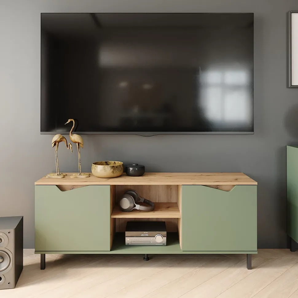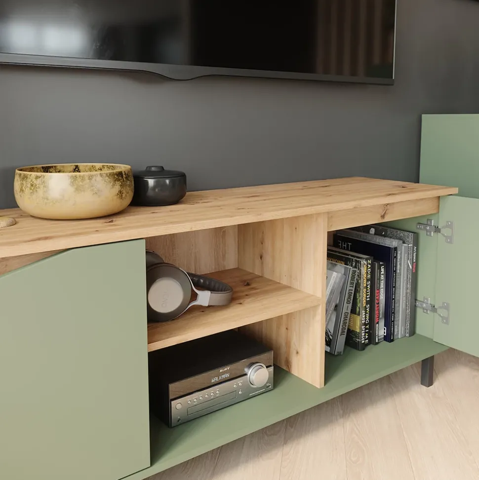 - Mit zwei offenen Fächern und zwei Türen hält der Fernsehtisch alles für Geräte und Zubehör gut organisiert bereit.